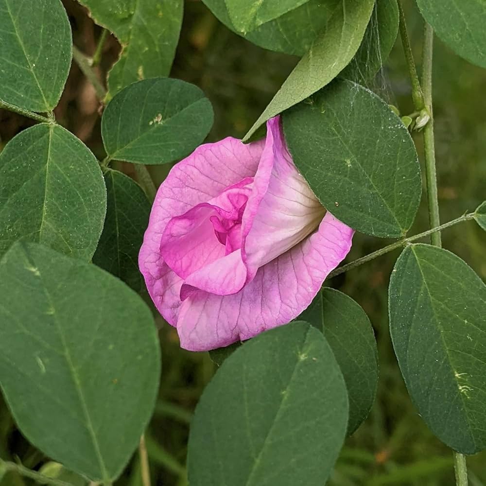 Clitoria ternatea ‘Double Pink’ is a rare and ornamental cultivar of the butterfly pea, distinguished by its fully double, soft pink flowers that resemble small roses. This twining perennial vine is native to tropical regions and is prized for its delicate yet abundant blooms and graceful climbing habit. The plant produces slender stems with pinnate leaves composed of small, oval leaflets, creating a light, airy foliage that complements its showy flowers.