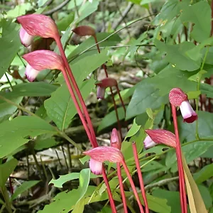The leaves are long and narrow, up to 70 cm, bright green on top and velvety beneath, giving the plant a lush tropical look. After flowering, it forms purple-green, ellipsoid capsules with winged ribs, each about 2.5 to 3 cm long, which remain closed around the seeds.