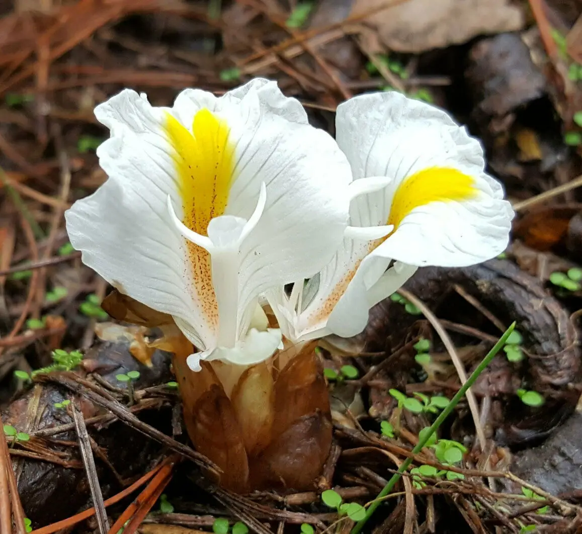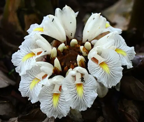 Java Cardamom is a tall, leafy plant that grows 1 to 3.5 meters high. It produces round clusters of flowers about 3 to 5 cm across, held on short stalks. The flowers are mostly white, with yellow and red markings on the lip, and sit among reddish bracts that add a splash of color.