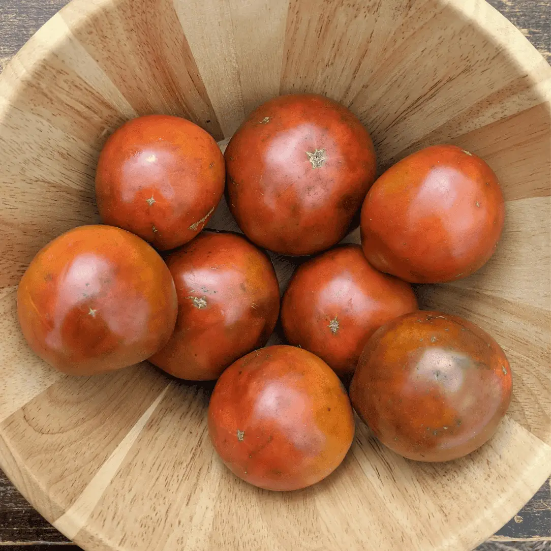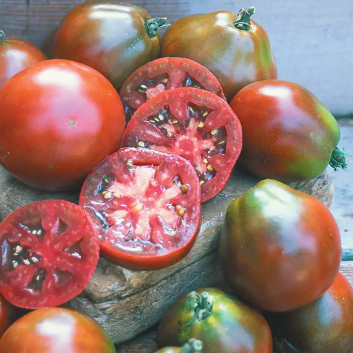 Solanum lycopersicum ‘Japanese Trifele Black’ is an heirloom tomato variety prized for its distinctive pear- to truffle-shaped fruits and rich, complex flavor. The indeterminate plants are vigorous and productive, typically reaching 1.8 to 2.4 meters in height, and benefit from staking or caging. Fruits are medium-sized with a characteristic ribbed or pear-like form, displaying deep mahogany to dark purplish-brown skin and dense, dark red flesh. The flavor is sweet, earthy, and slightly smoky, making this variety excellent for fresh salads, roasting, sauces, and specialty culinary uses.