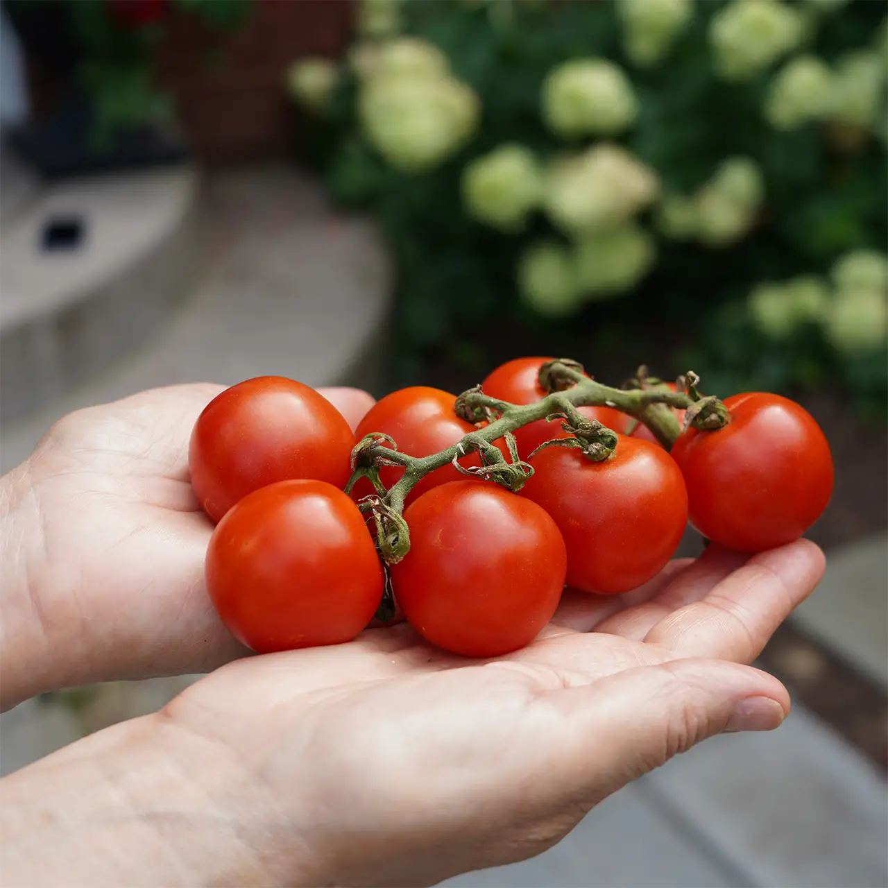 Solanum lycopersicum ‘Large Red Cherry’ is a productive tomato variety valued for its generous clusters of medium-sized cherry to small salad-type fruits. The plants are indeterminate and vigorous, typically reaching 1.8 to 2.4 meters in height, and require staking or caging to support continuous fruiting. Fruits are round, smooth, and bright red, larger than typical cherry tomatoes, with juicy flesh and a classic, well-balanced tomato flavor that combines mild sweetness and acidity. This variety is well suited for fresh snacking, salads, garnishes, and light cooking.