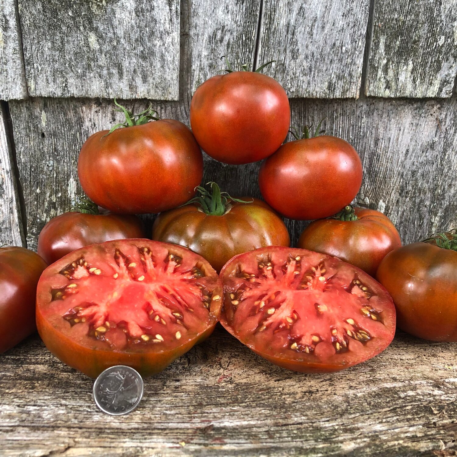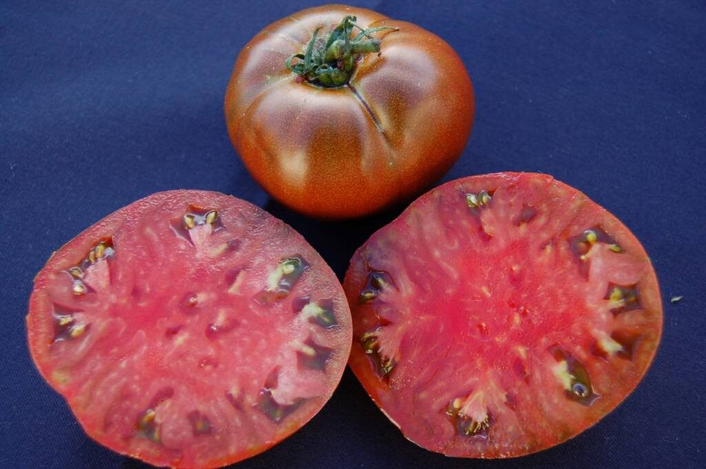 Solanum lycopersicum ‘Paul Robeson’ is a highly regarded heirloom tomato variety originating from Russia, prized for its rich, complex flavor and dark, smoky undertones. The indeterminate plants are vigorous and productive, typically reaching 1.8 to 2.4 meters in height, and require staking or caging to support the heavy fruit load. Fruits are medium to large, round to slightly flattened, with deep mahogany to purplish-brown skin and dark red flesh. The flavor is bold and well balanced, combining sweetness, acidity, and a distinctive earthy depth, making this variety especially valued for fresh slicing and gourmet culinary uses.
