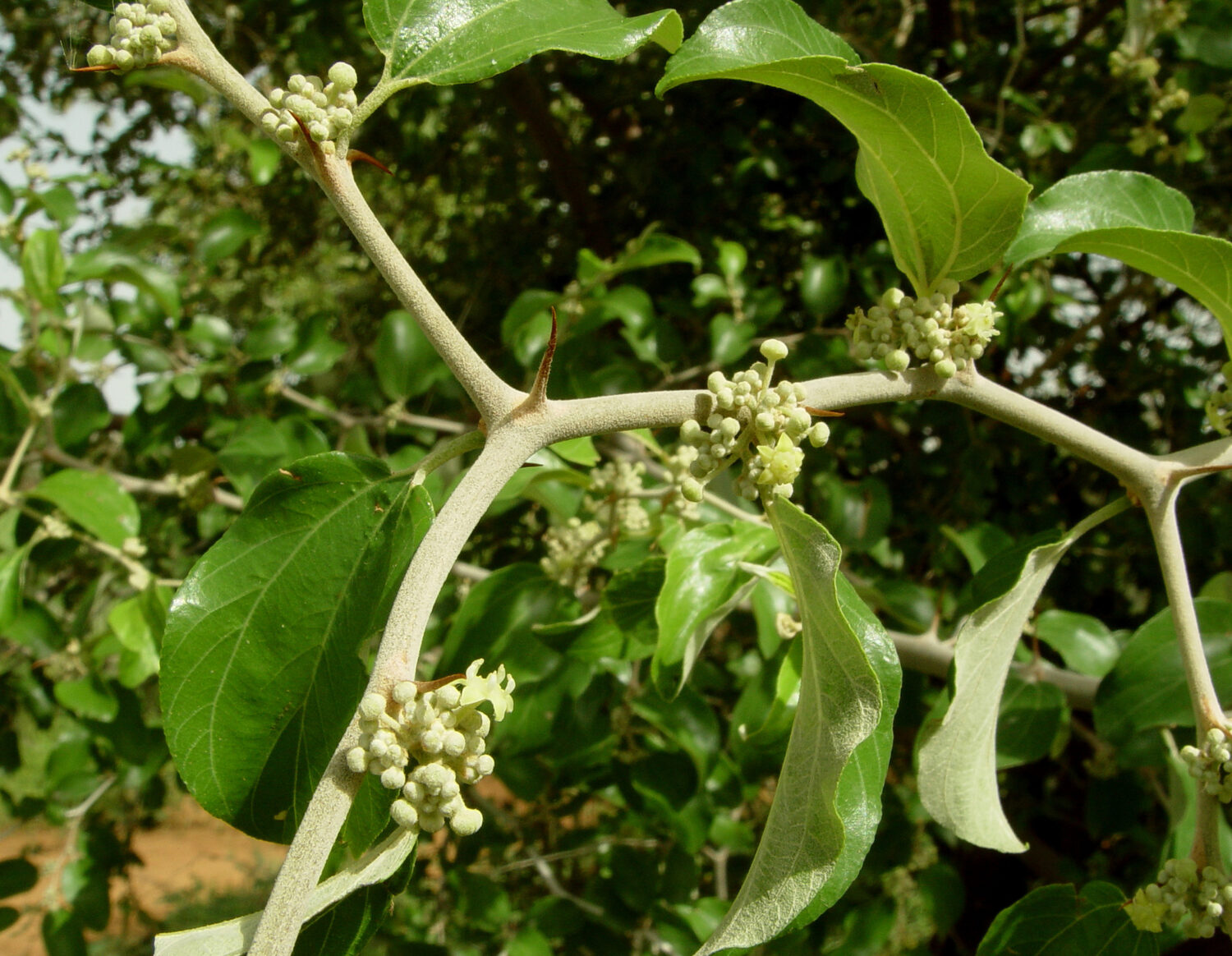 Ziziphus mauritiana is a medium-sized tree that grows vigorously and has a rapidly developing taproot, a necessary adaptation to drought conditions. The species varies widely in height, from a bushy shrub 1.5 to 2 m tall, to a tree 10 to 12 m tall with a trunk diameter of about 30 cm. Z. mauritiana may be erect or wide-spreading, with gracefully drooping thorny branches, zigzag branchlets, thornless or set with short, sharp straight or hooked spines.