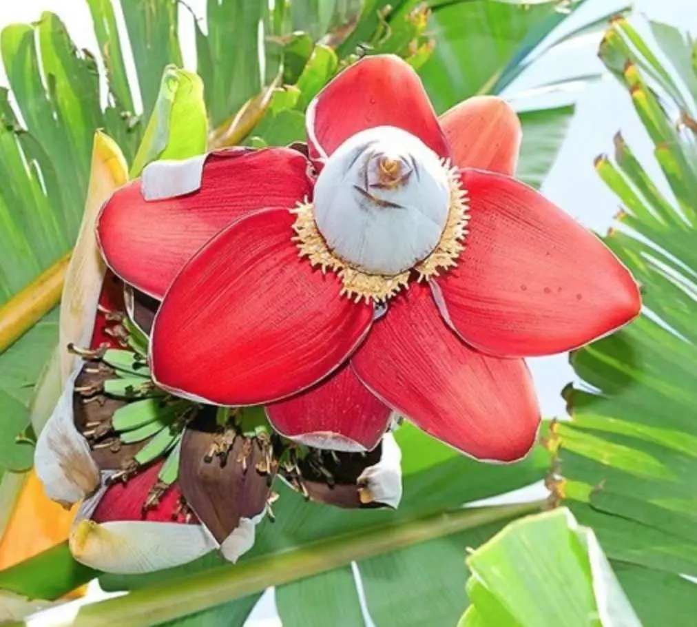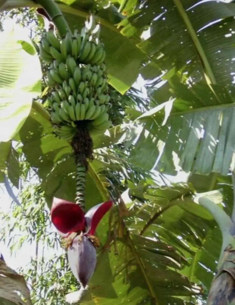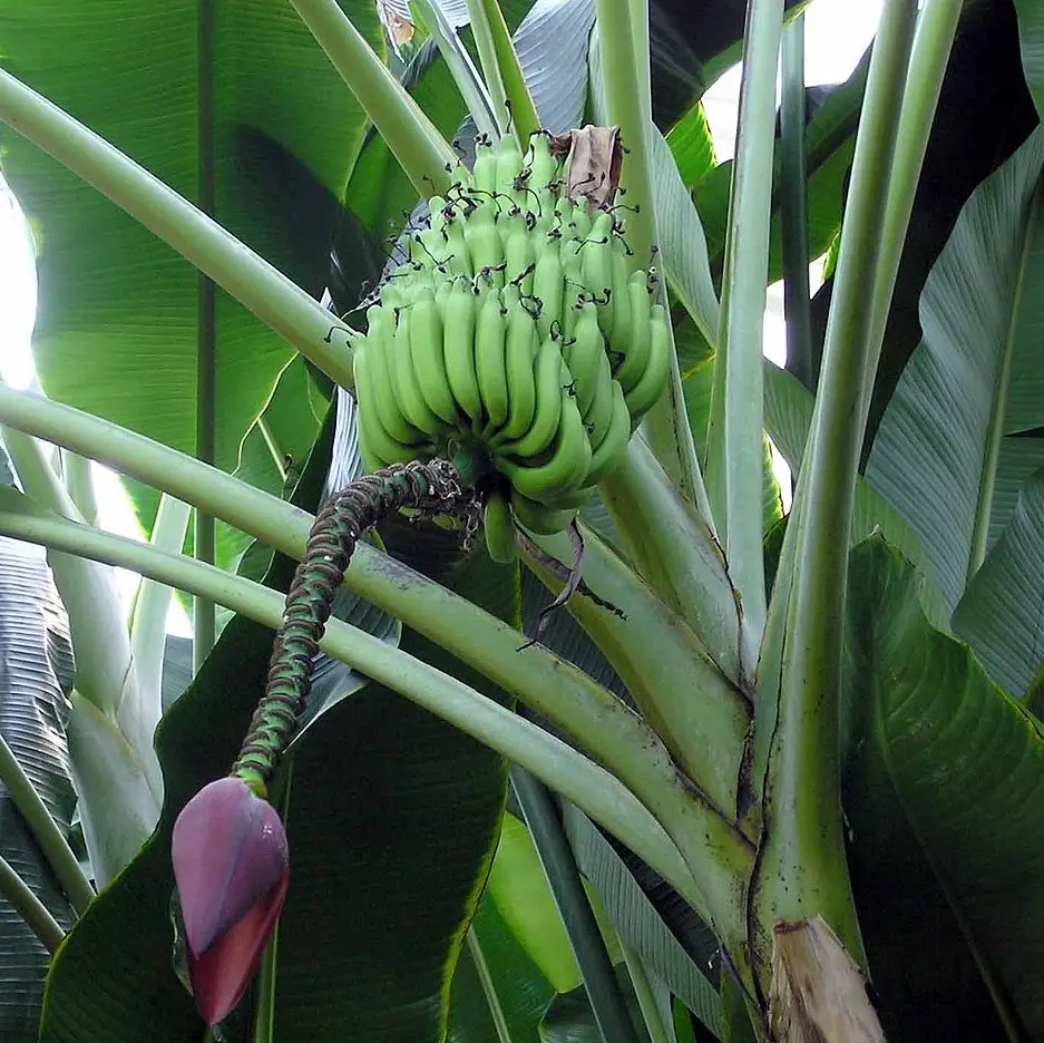 An obscure but exciting banana native to India, Myanmar, Tibet, Sri Lanka and east to Papua New Guinea, Musa balbisiana is perhaps one of the progenitors of the commercial banana. It grows at some altitude so may tolerate cool conditions, but its main characteristic is its huge flower. As with others in the genus, rich soil is required for maximum growth, together with plenty of fertilizer and an adequate supply of water. Given these and some summer warmth, it is almost dangerously fast growing and can ultimately reach a height of nearly 10 m (33 ft.)