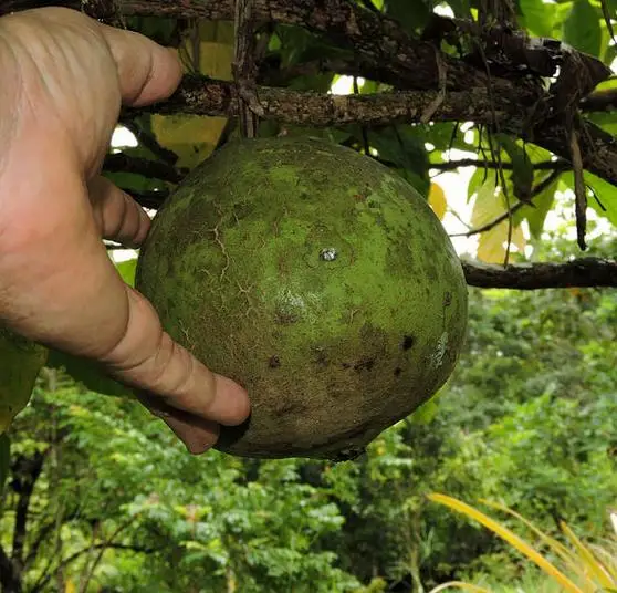 Borojo is a dioic plant, the male plants have cots of white aromatic flowers and the feminine plants have a single white flower in the head of the branches. Only the feminine plants produce fruits. Your fruits can vary between 8 and 12 centimeters of diameter and average weight of 750 – 1000 grams, where the pulp represents 88% of the total weight ..