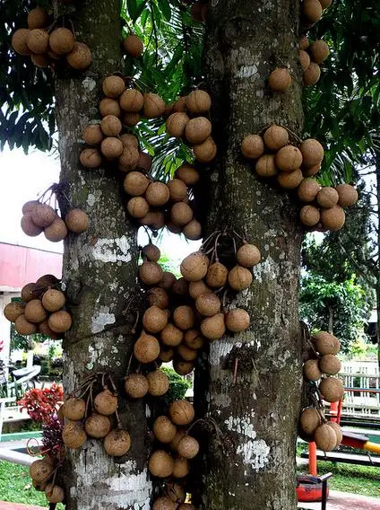 One of its most distinctive features is its cauliflorous fruiting habit, where small, brownish to yellow fruits develop directly on the trunk and main branches. The fruits are oval to round, with a soft, aromatic flesh that has a unique flavor often described as a blend of mango and mangosteen with earthy undertones. Historically, the fruit has been valued not only for consumption but also for its reputed fragrant properties.