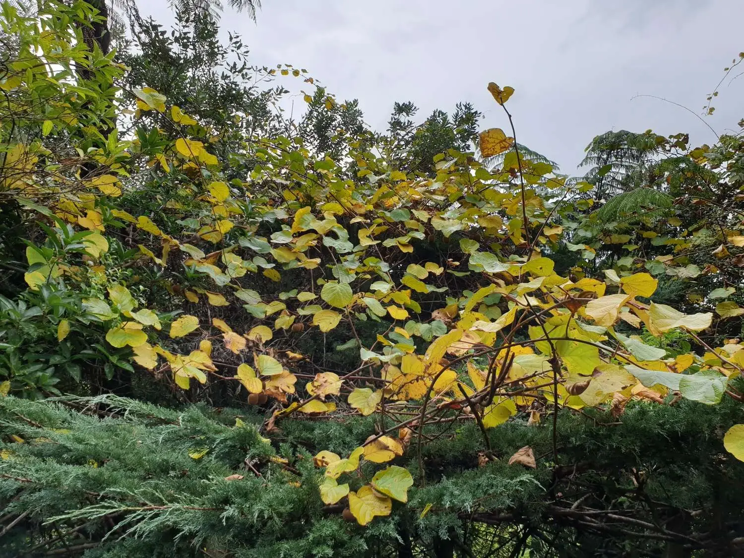 In its native habitat Actinidia chinensis grows in thickets, thick (oak) forests (e.g. Quercus aquifolioides, Quercus oxyodon, Quercus lamellosa), and light secondary forests and bushland. A. chinensis prefers slopes and likes also to grow in ravines, top heights of 200–230 m (660–750 ft), relative to the local microclimate. In Western gardens it may range 30 feet (9.1 m) in all directions, making it unsuitable for all but the largest spaces unless pruned back hard at the end of every growing season.