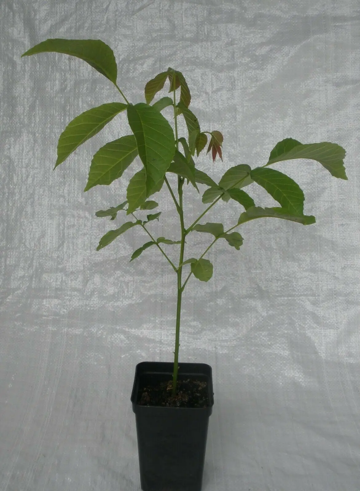 Juglans regia is a large deciduous tree, attaining heights of 25–35 metres (80–120 feet), and a trunk up to 2 m (6 ft) in diameter, commonly with a short trunk and broad crown.