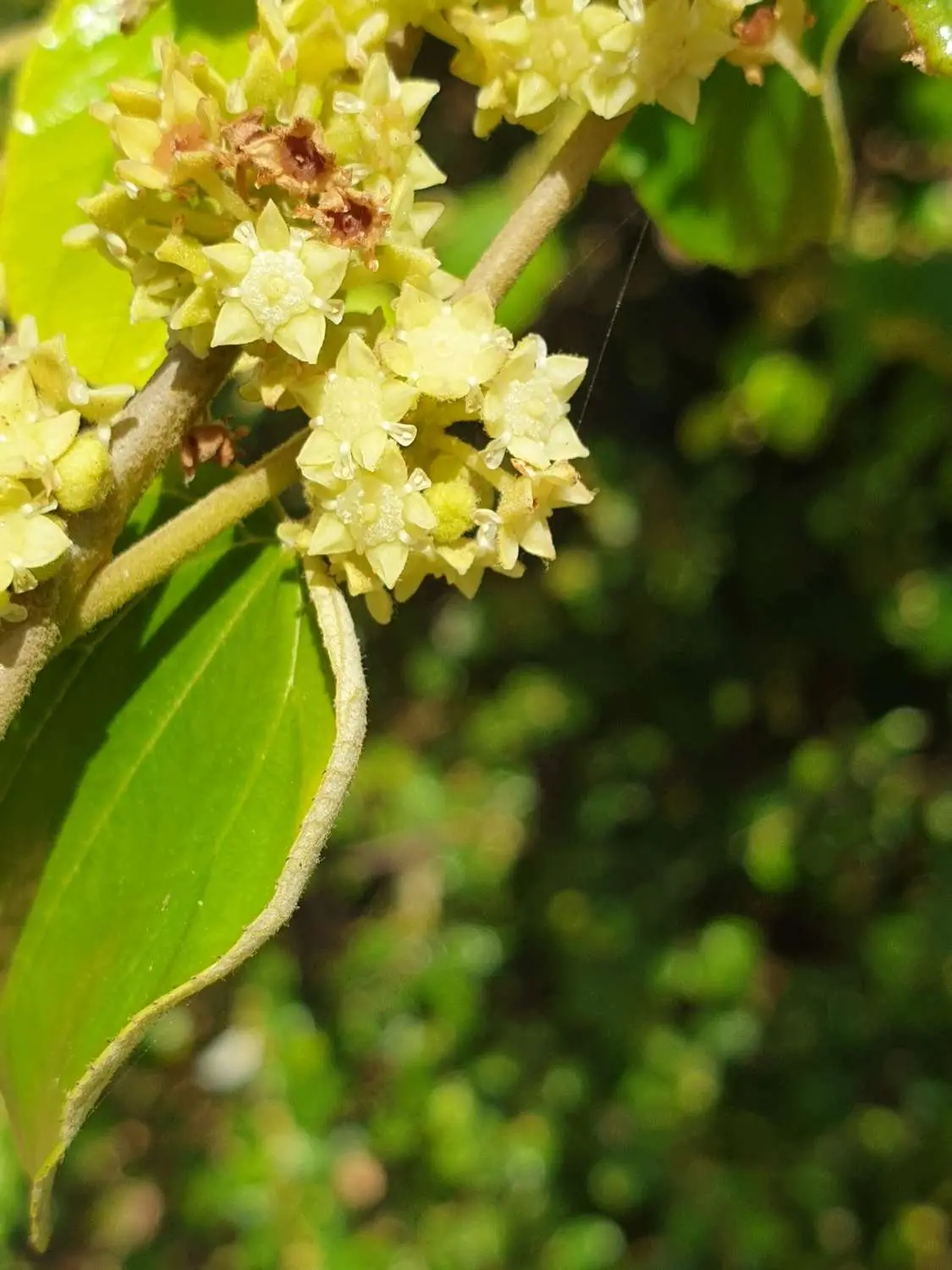 The flowers are tiny, yellow, 5-petalled and are usually in twos and threes in the leaf axils. Flowers are white or greenish white and the fruits are orange to brown, 2–3 cm long, with edible white pulp surrounding a 2-locular pyrene.