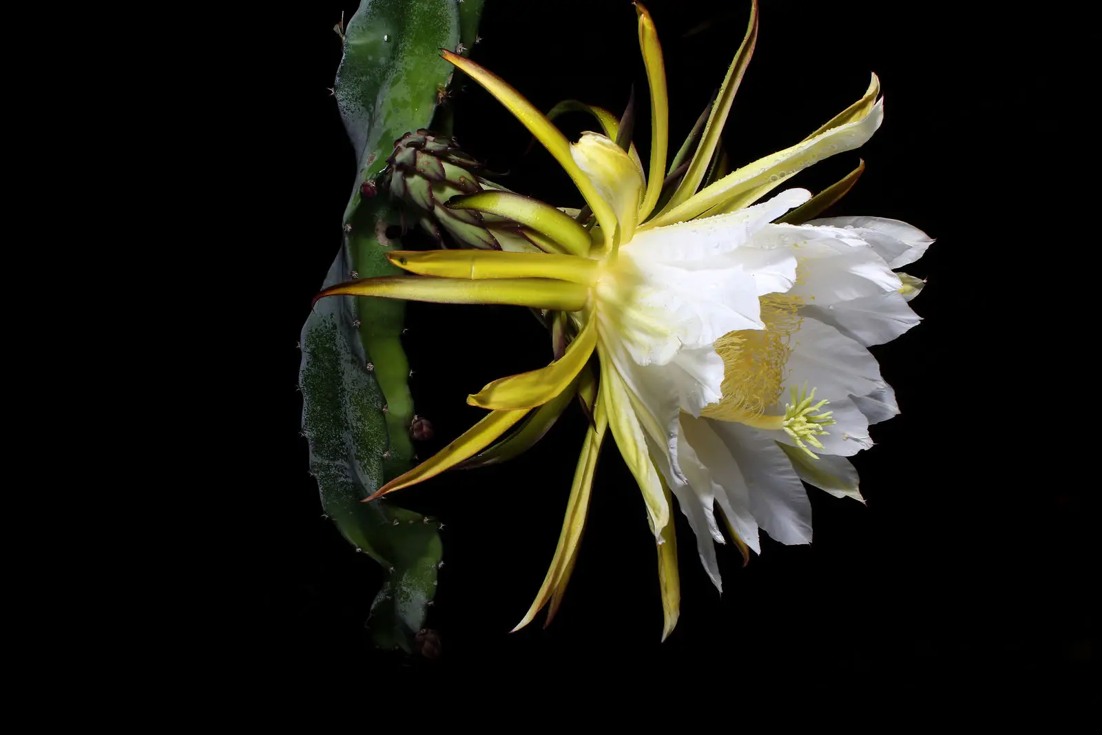 Red Dragon Fruit, also known as pitaya or pitahaya, is a fruiting cactus variety native to Central and South America. The plant grows to around 10 to 15 feet high with multiple stems and branches, and produces stunning white flowers that bloom during the night from early summer to early fall.