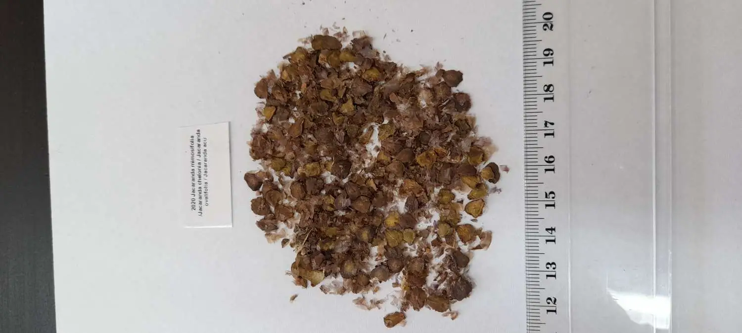 The tree grows to a height of up to 20 m (66 ft). Its bark is thin and grey-brown, smooth when the tree is young but eventually becoming finely scaly. The twigs are slender and slightly zigzag; they are a light reddish-brown. The flowers are up to 5 cm (2 in) long, and are grouped in 30 cm (12 in) panicles. They appear in spring and early summer, and last for up to two months. They are followed by woody seed pods, about 5 cm (2 in) in diameter, which contain numerous flat, winged seeds. The blue jacaranda is cultivated for the sake of its large compound leaves, even in areas where it rarely blooms. The leaves are up to 45 cm (18 in) long.