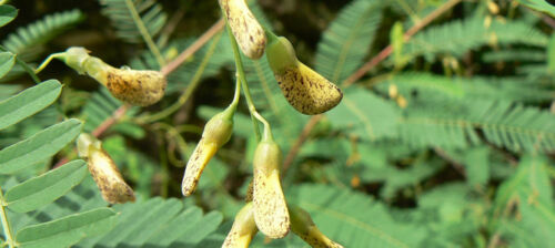 Beautiful shrub or small tree that grows from 7 to 20 feet with bright yellow blossoms that hang gracefully down from delicate, green-leaved foliage. Petals are similar in arrangement to pea flowers. This fast growing tropical remains small and loves hot, humid temperatures and plenty of water. Cannot tolerate snowy or cold weather. Perfect as a tropical container or standard in zones 9+ (protected from frost), deck plant or greenhouse specimen. A multi purpose plant used for fibers and fuel, fast growing shade areas, fodder and soil fertility as a green manure legume.