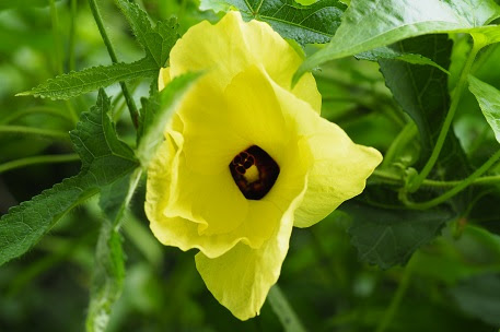 An upright shrub to 2.5 m in height, native to tropical and warm-temperate regions of Asia, but cultivated elsewhere due to its economic importance, as the source of a highly prized aromatic oil. It forms a long and slender tap root, hairy, dark green leaves, very variable in shape and conspicuous yellow flowers with a purple center, followed by oblong fruit capsules containing scented black seeds. Aside its use in the cosmetic industry, Abelmoschus moschatus has a variety of application in traditional medicine. It is drought tolerant and will grow well in USDA Zones 9 to 11.