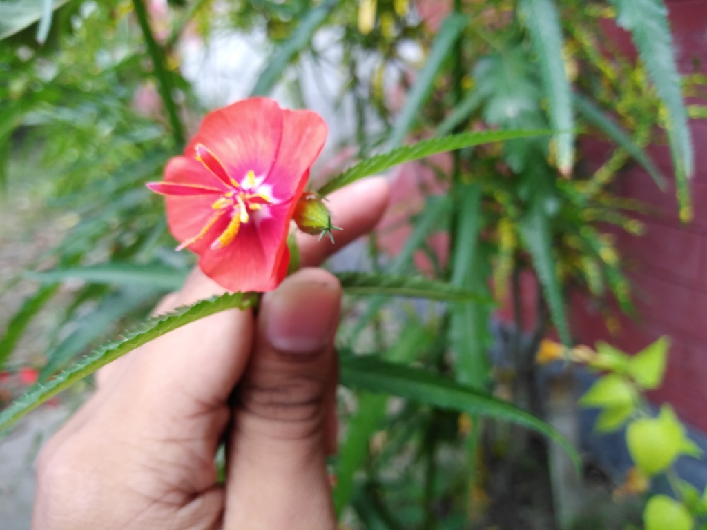 This is Pentapetes phoenicea, also known as Noon Flower, Midday Flower, Scarlet Mallow, Simine, Flor impia, and Copper Cups. This plant likes to live in full sun to partial shade where it grows to about 4 feet tall. The scarlet red blossoms are on display from late spring until the middle of Fall and they attract a wide array of birds, bees, and butterflies.