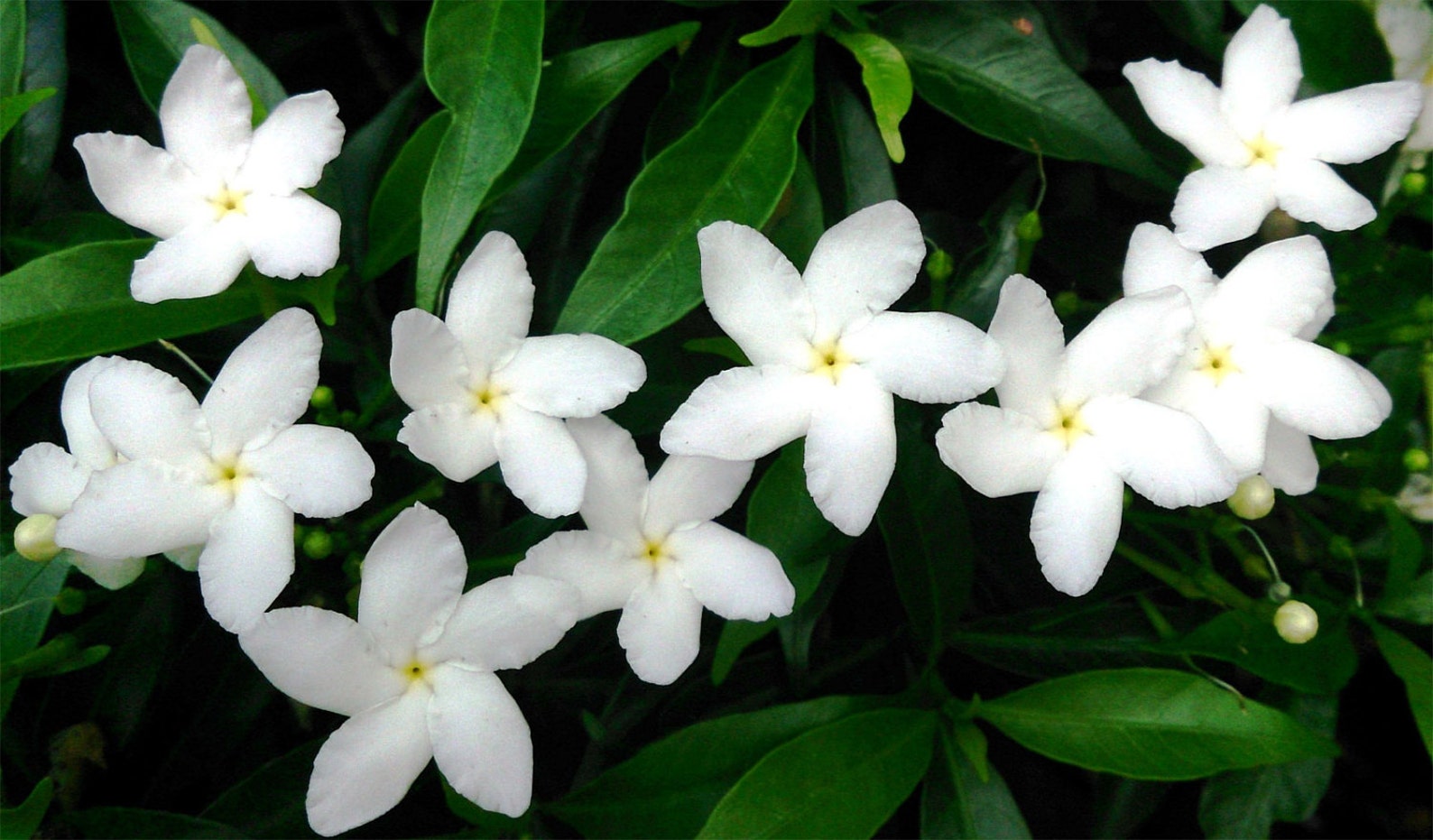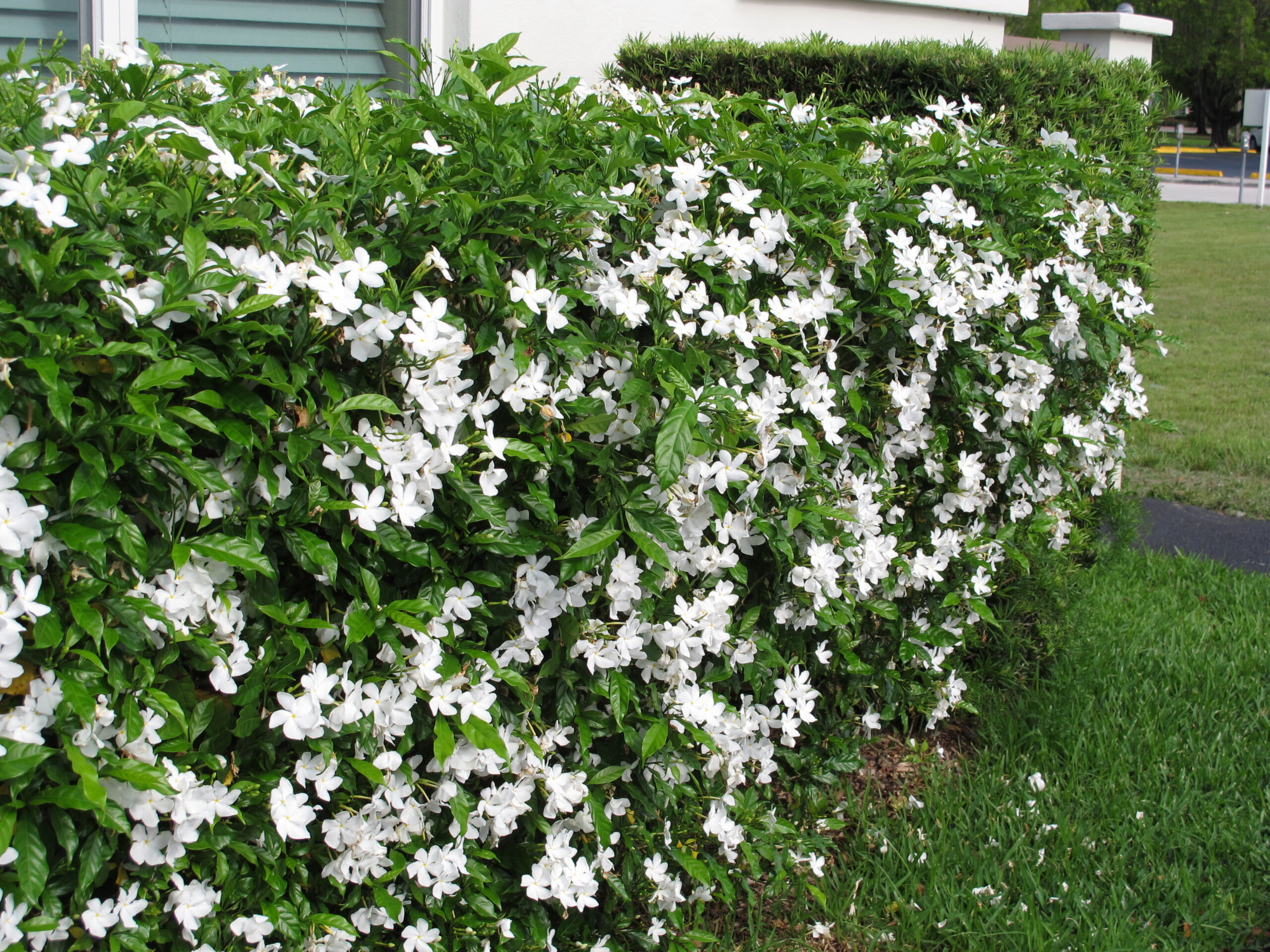 The plant generally grows to a height of 1.5–1.8 metres (5–6 ft) and is dichotomously branched. The large shiny leaves are deep green and about 15 cm (6 in) in length and 5 cm (2 in) in width. The waxy blossoms are found in small clusters on the stem tips. The (single) flowers have the characteristic ‘pinwheel’ shape also seen in other genera in the family Apocynaceae such as Vinca and Nerium. Both single and double-flowered forms are cultivated, the flowers of both forms being white. The plant blooms in spring but flowers appear sporadically all year. The flowers have a pleasing fragrance. More than 66 alkaloids are found in the shrub.[6]