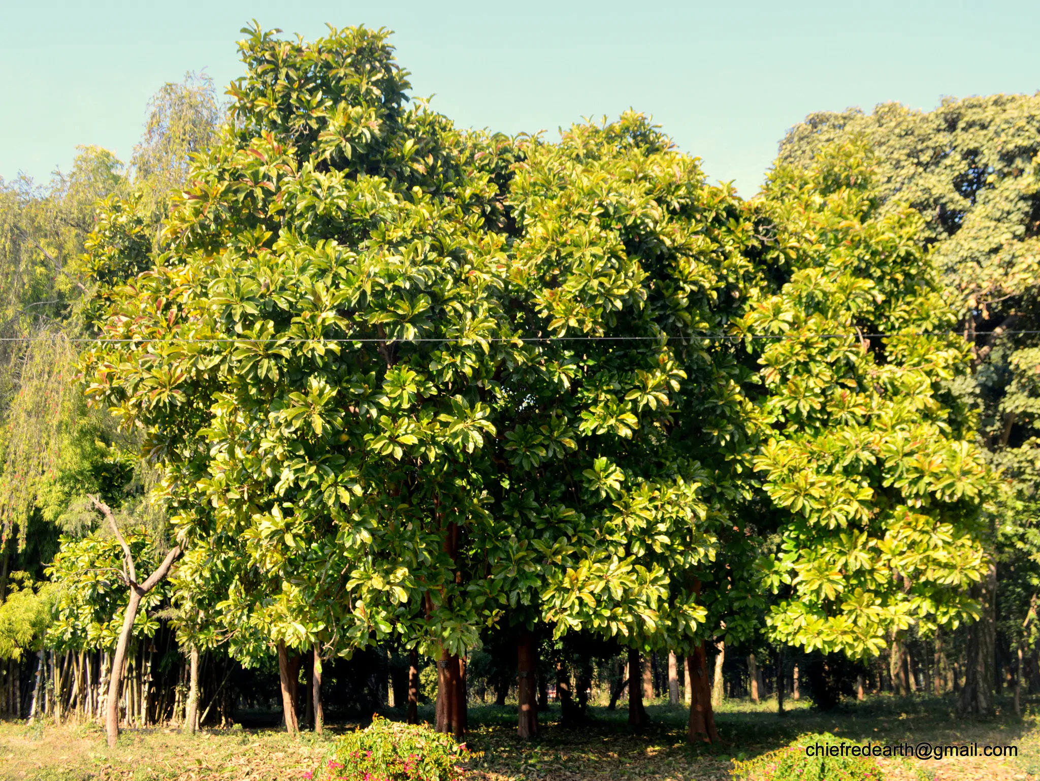 It is an evergreen large shrub or small to medium-sized tree growing to 15 m tall. The leaves are 15–36 cm long, with a conspicuously corrugated surface with impressed veins. Its branches are used to make good firewood. The flowers are large, 15–20 cm diameter, with five white petals and numerous yellow stamens. Its characteristic round fruits are large, greenish yellow, have many seeds and are edible. The fruit is a 5–12 cm diameter aggregate of 15 carpels, each carpel containing five seeds embedded in an edible but fibrous pulp.