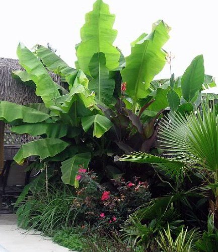 Wow! This large banana species sports a massive pseudostem to 4.5 m (14 ft.) tall and 45 cm (18 in.) in diameter, which is tinged with red. Its new leaves and leaf midribs are purple, and a percentage of plants even exhibit beautifully dark red mottled leaves when young. The Darjeeling Banana is very hardy to cold (i.e. in the sense of Musa basjoo), coming, as it does, from montane forests up to 2000 m (6000 ft.) in the Himalayas of Northeast India. First trials outdoors in the U.S., Britain, Germany, and Switzerland have shown an excellent resistance to cold and frost. Like all bananas, it is extremely fast growing given rich soil and an abundance of water. The fruits have a sweetish pulp but are hard and contain a few large seeds. The Darjeeling Banana was originally introduced into cultivation and made popular by Toby Spanner and Martin Gibbons, and it now shows to live up well to the expectations that were placed in it as an ornamental for the temperate as well as the cooler tropical garden. It has more potential than any other cold tolerant Musa in cultivation today.