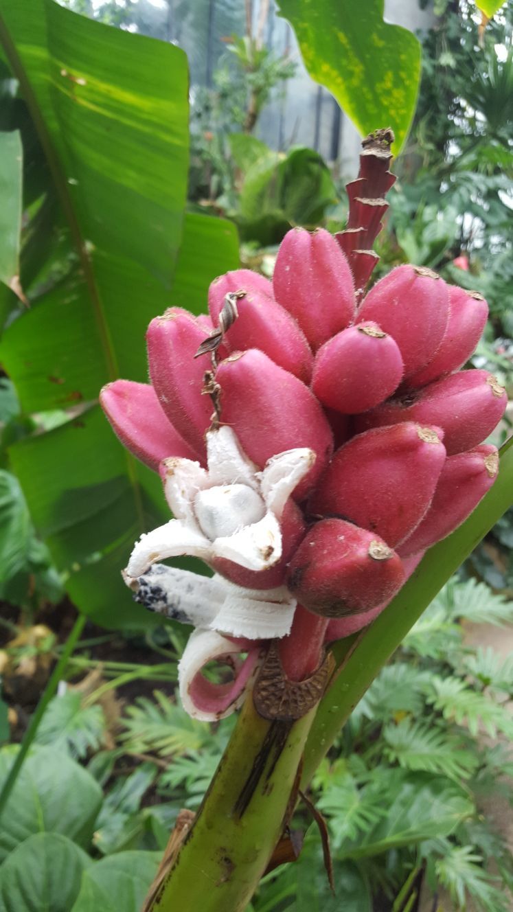 This delightful dwarf banana, to only 1.2 m (4 ft.) tall, is certainly very deserving of a common name that calls attention to its “pinkness.” Its somewhat waxy leaves have a pinkish midrib, the flowers are pink to orange, and the very ornamental fruits, dwarf bananas, are a bright, velvety pink, and last for months at a time. The bananas are edible and quite sweet, but also full of seeds. This species is originally native to the eastern Himalayas and Assam. It is very cold tolerant and will survive even frosty winters outside if heavily mulched. Alternatively, it makes an excellent indoor plant and is one of the few bananas that will actually flower and fruit in the house.