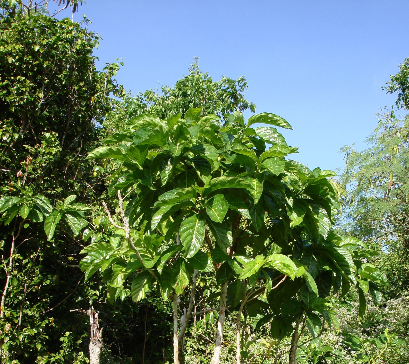 Originally native to Southeast Asia and Australia, the noni tree is now widely cultivated in tropical regions. The odd-shaped and rather strong tasting fruit have received some attention for their anti-cancer potential. Morinda citrifolia is a fast growing pioneer tree and adapts well to a wide range of conditions. Its attractive, evergreen foliage also makes it a nice ornamental tree. Seeds will germinate much quicker and more uniform if scarified with sandpaper or the like.