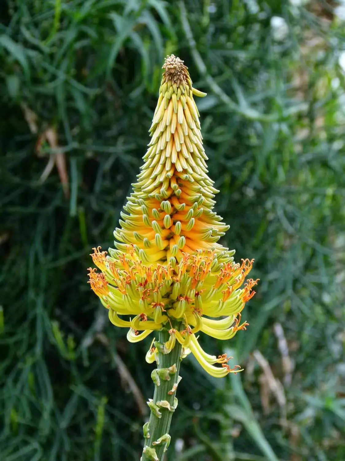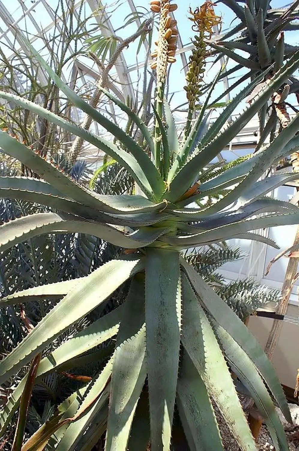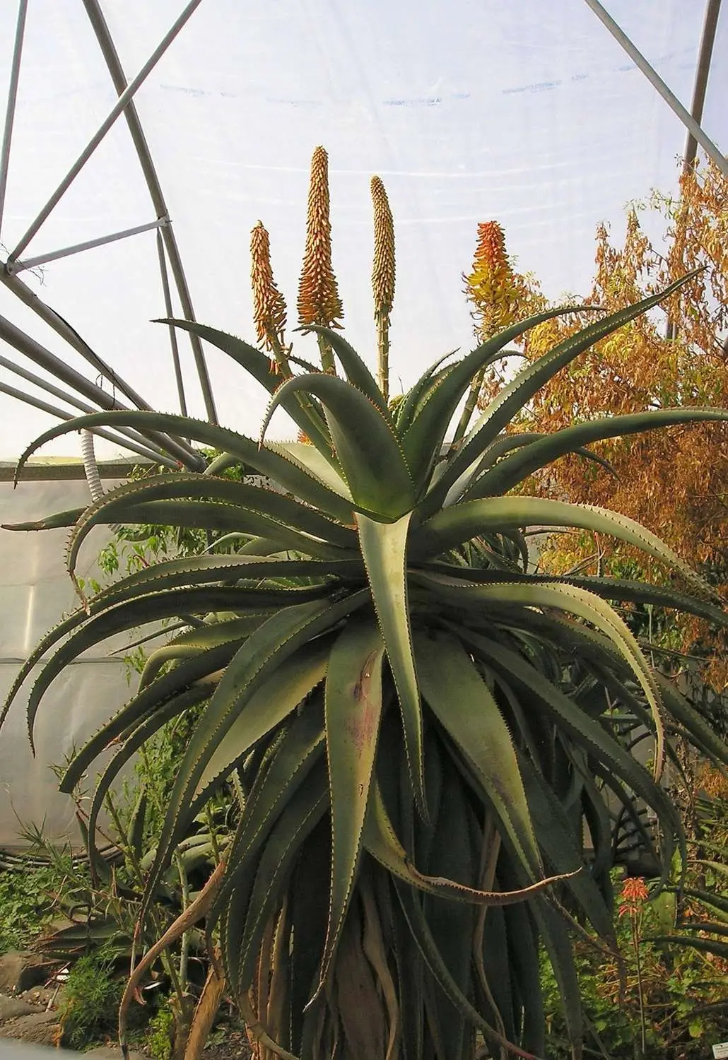 A large Aloe native to low, dry scrubland in South Africa’s Cape Province that can form stems to 4 m tall covered in persistent dead leaves. The broad, deeply keeled leaves are dull green to bluish, the large inflorescence is branched only in a few long, densely flowered spikes. As easy to grow as most other large Aloe, it makes a stunning plant for cultivation in warm temperate and some tropical climates in USDA Zones 9 and above.