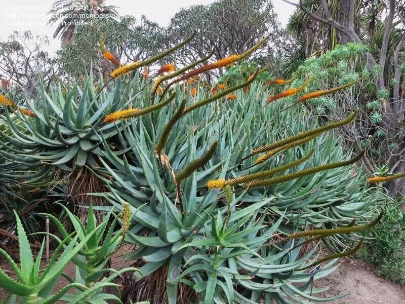 A wonderful Aloe that forms a shrub or small tree to nearly 4 m tall with short, thick branches that hold rosettes of narrow, green or pale blue leaves. The inflorescences are sparsely branched and look like cat’s tails. Easily grown from seed in warm temperate and tropical climates in USDA Zones 9 to 11.