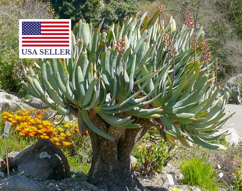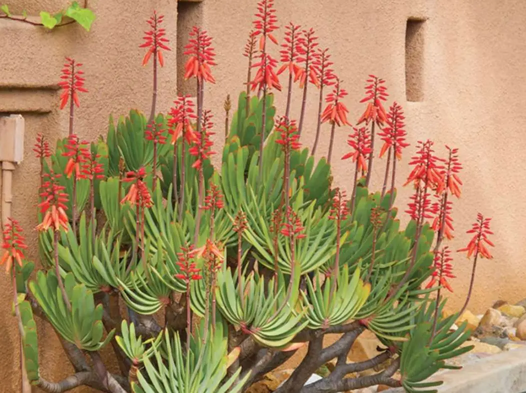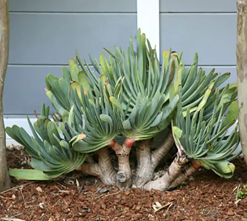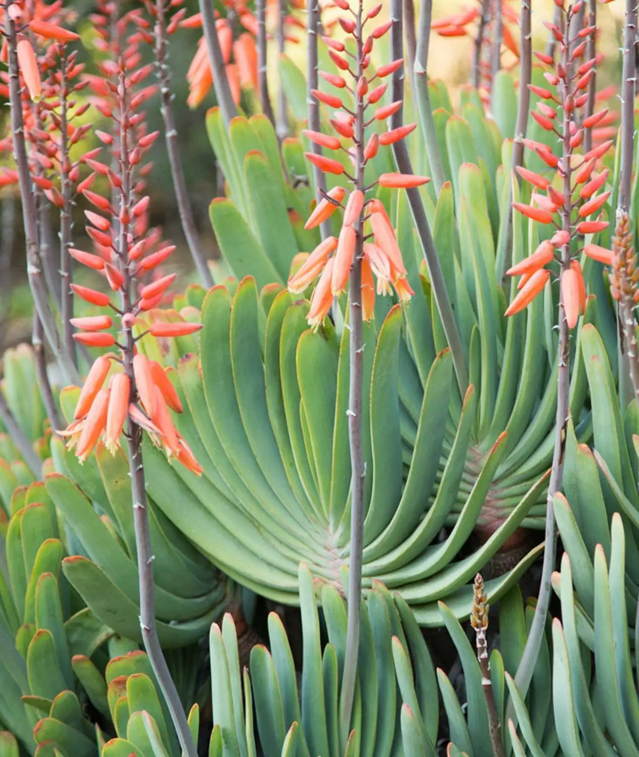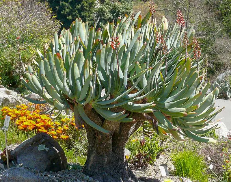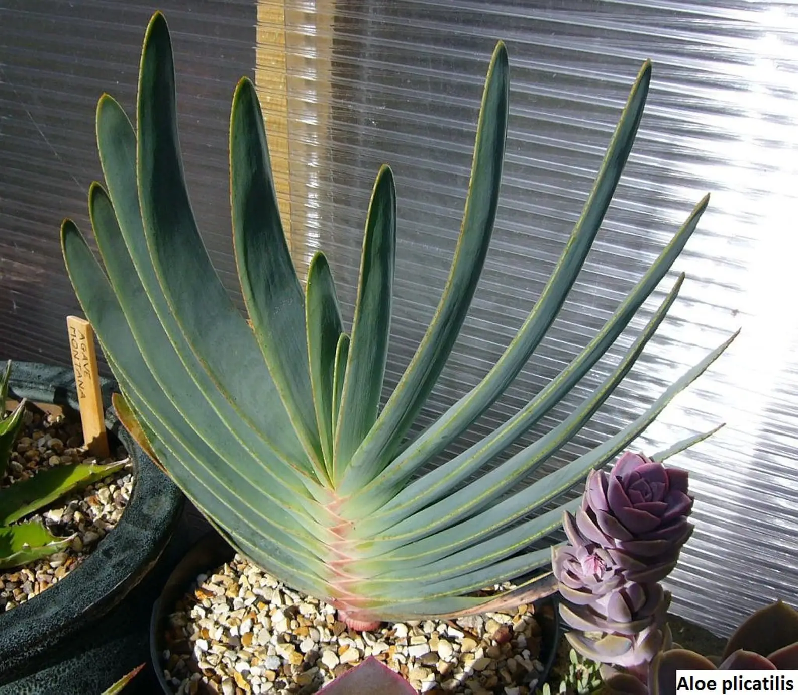 This unusual, striking Aloe grows into a compact, well branched shrub rarely more than 2 m tall. The ascending, unarmed, pale blue leaves form small, distichous crowns and the erect, unbranched inflorescences hold orange red flowers. Aloe plicatilis is native to the mountains of South Africa’s southwestern Cape Province where it grows in scrubland (fynbos) on steep, rocky slopes between 1000 and 1400 m. It is one of the hardier Aloe and will do well in many warm temperate climates, especially of the mediterranean type with winter rain.