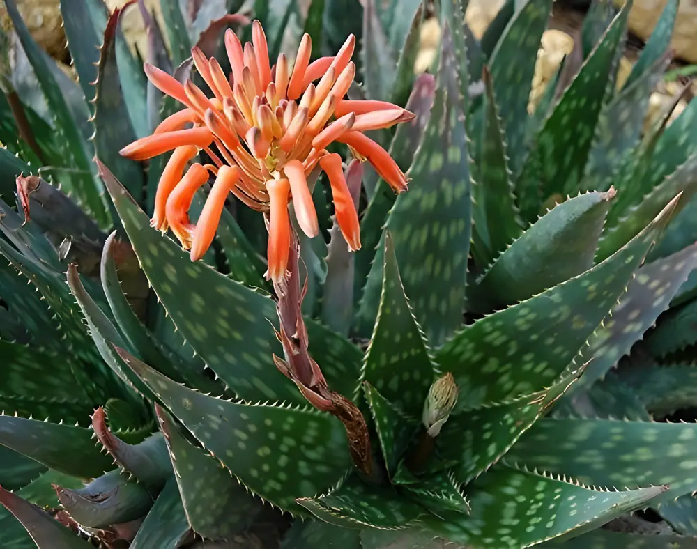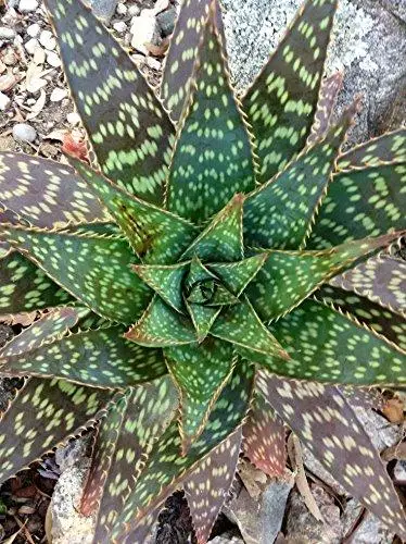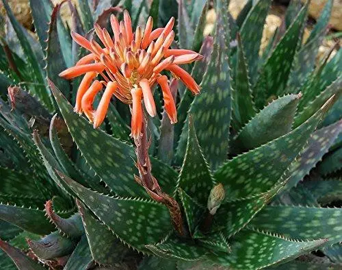 A smallish Aloe native to scrub and grasslands in southern Africa. It forms a spreading rosette of broad, dark green leaves with attractive white markings. The inflorescence is few branched and flower color can vary from yellow to red. Aloe maculata “Robusta” is a particularly big form from the eastern Cape.