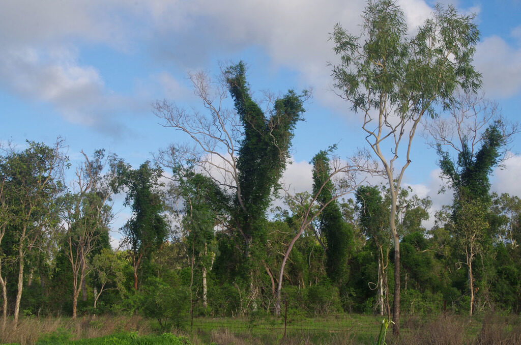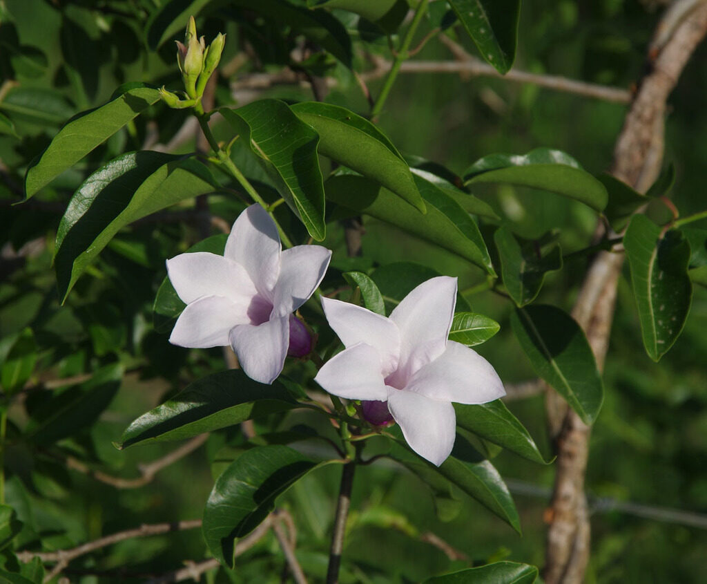 A woody vine that can grow as a small shrub or, if support from larger trees is available, as a rampant climber that can grow an amazing 5 m (16 ft.) in a single month and to 30 m tall. Originally native to Madagascar, it has now naturalized in many other tropical countries and is considered a noxious weed in Australia. In other places in the tropics it is still popular as an ornamental for its pretty flowers and its commercial grade latex. In the tropics it should perhaps best be avoided due to its invasive potential and its toxicity to livestock, but in mediterranean and desert climates where there is little chance of it escaping, it makes a great ornamental.