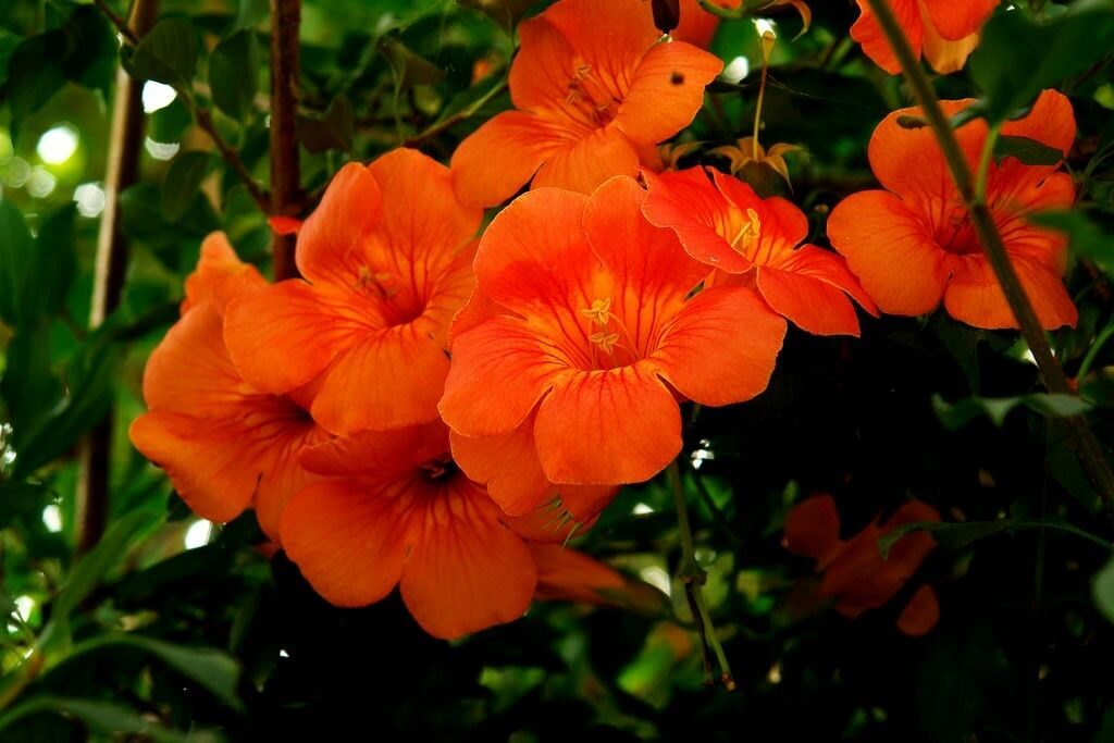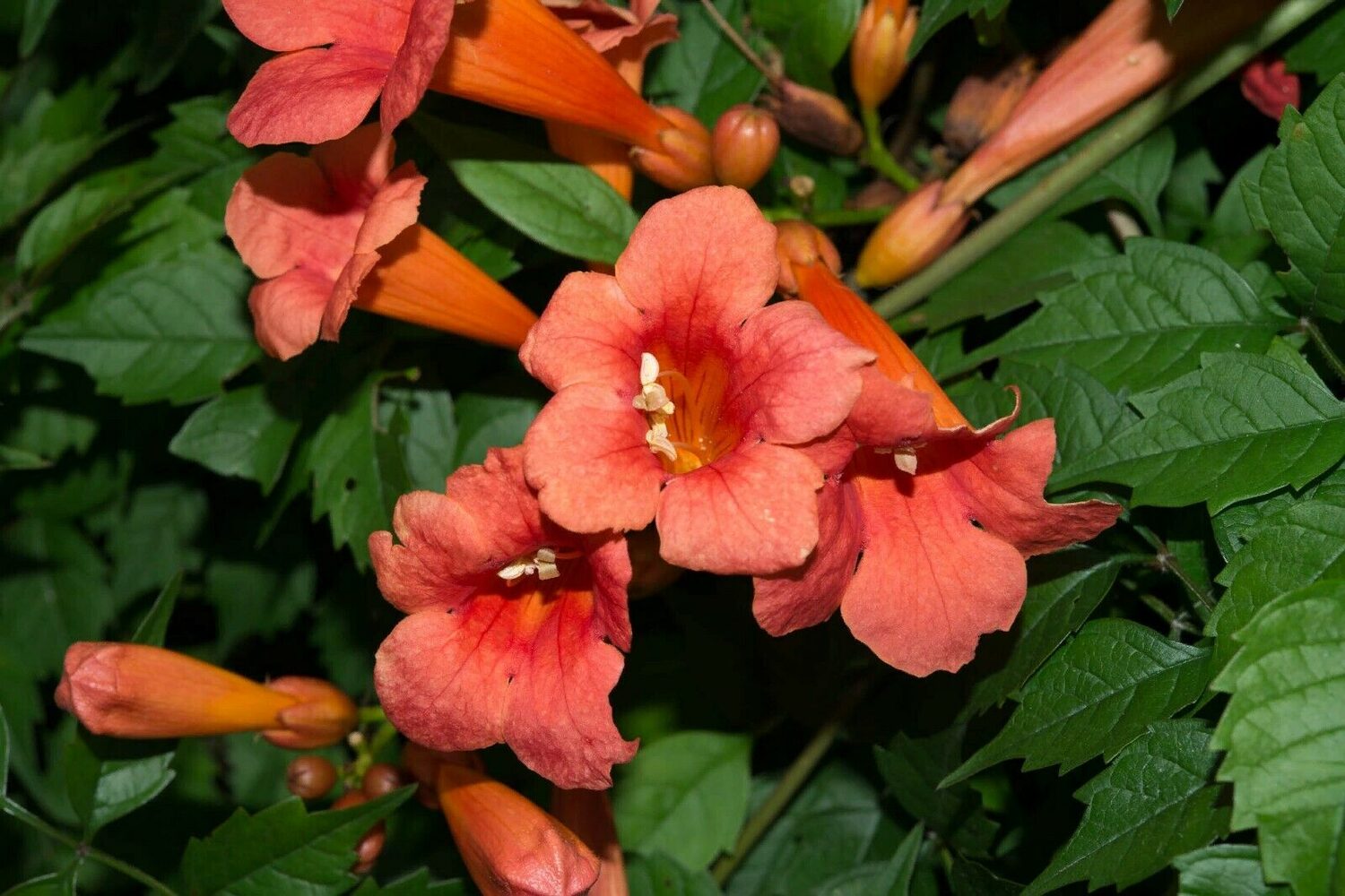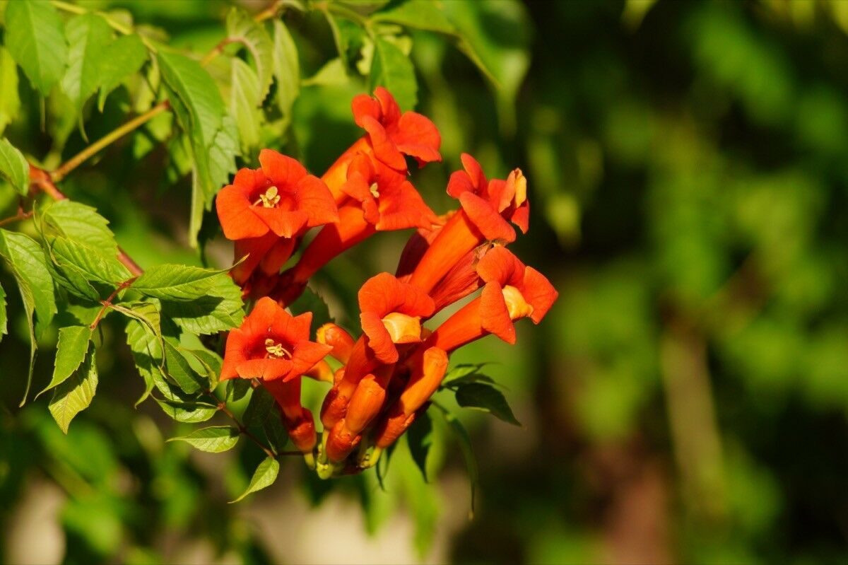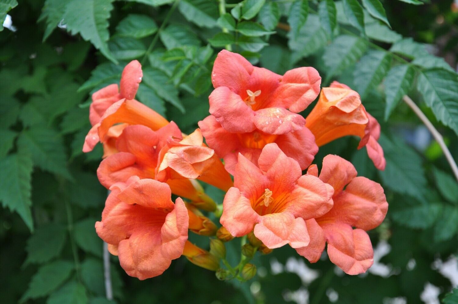 A large, very vigorous, deciduous climbing plant, originally native to the central and eastern U.S.A. but widely cultivated elsewhere in temperate climates as an ornamental for its gorgeous red, trumpet-shaped flowers. Especially in hot climates its growth can be rampant and it can quickly invade a garden. To keep it in check, prune back severely and reduce all side shoots to 5-10 cm in late winter before new growth appears. Suitable for USDA Zones 4 to 10.