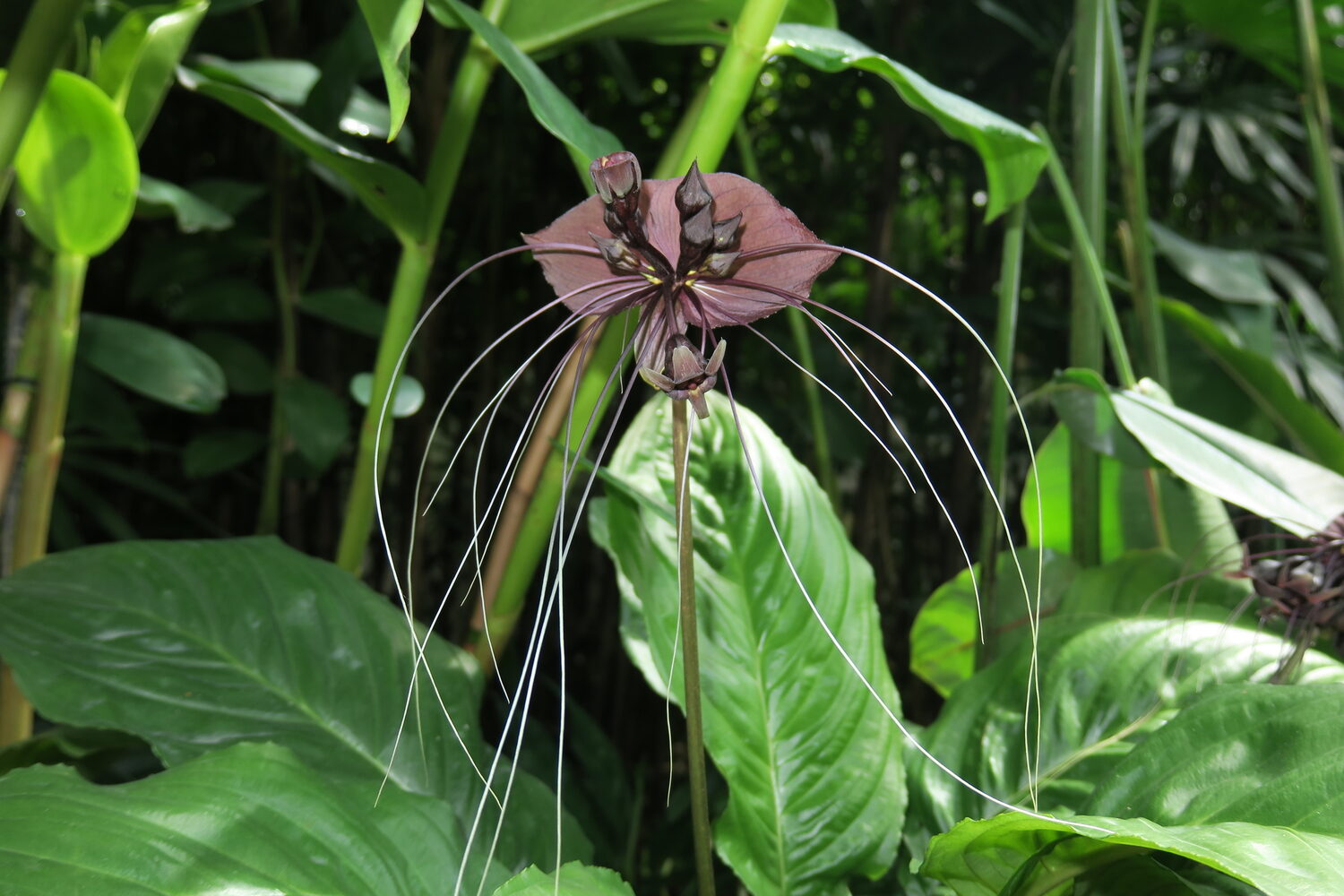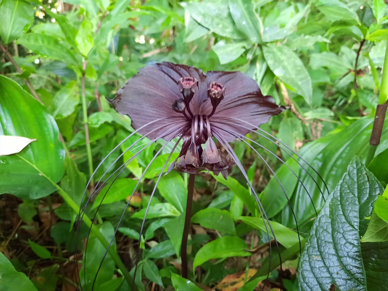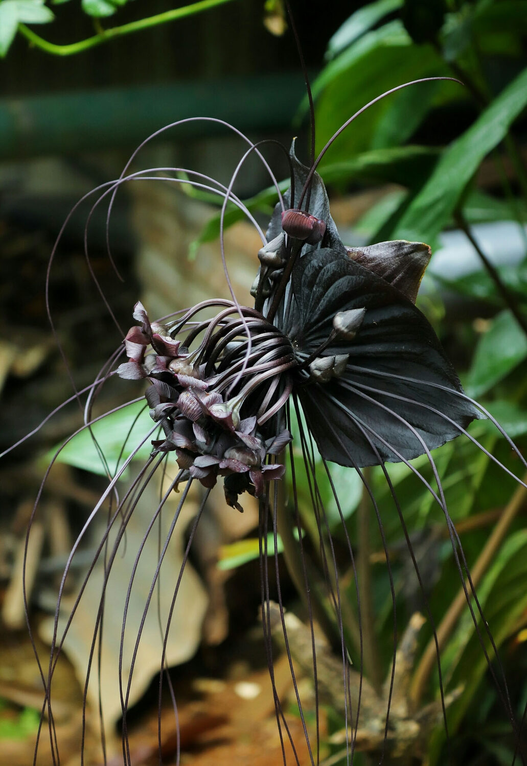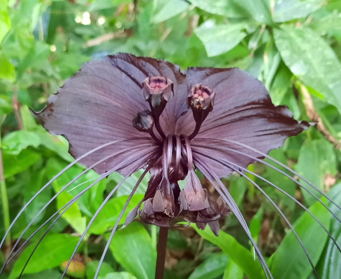 Tacca chantrieri is a rare and exotic perennial herb native to the tropical forests of Southeast Asia. It is renowned for its striking black to dark purple flowers resembling a bat in flight, complete with long whisker-like bracts that can extend up to 30 centimeters. The plant grows 60 to 90 centimeters tall, forming lush clumps of large, glossy green leaves. It thrives in warm, humid, shaded environments with rich, well-drained soil. Ideal for tropical gardens or indoor cultivation, the Black Bat Flower adds a dramatic and mysterious touch to any plant collection.