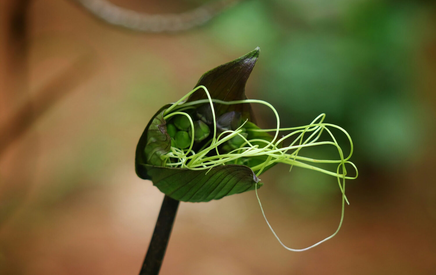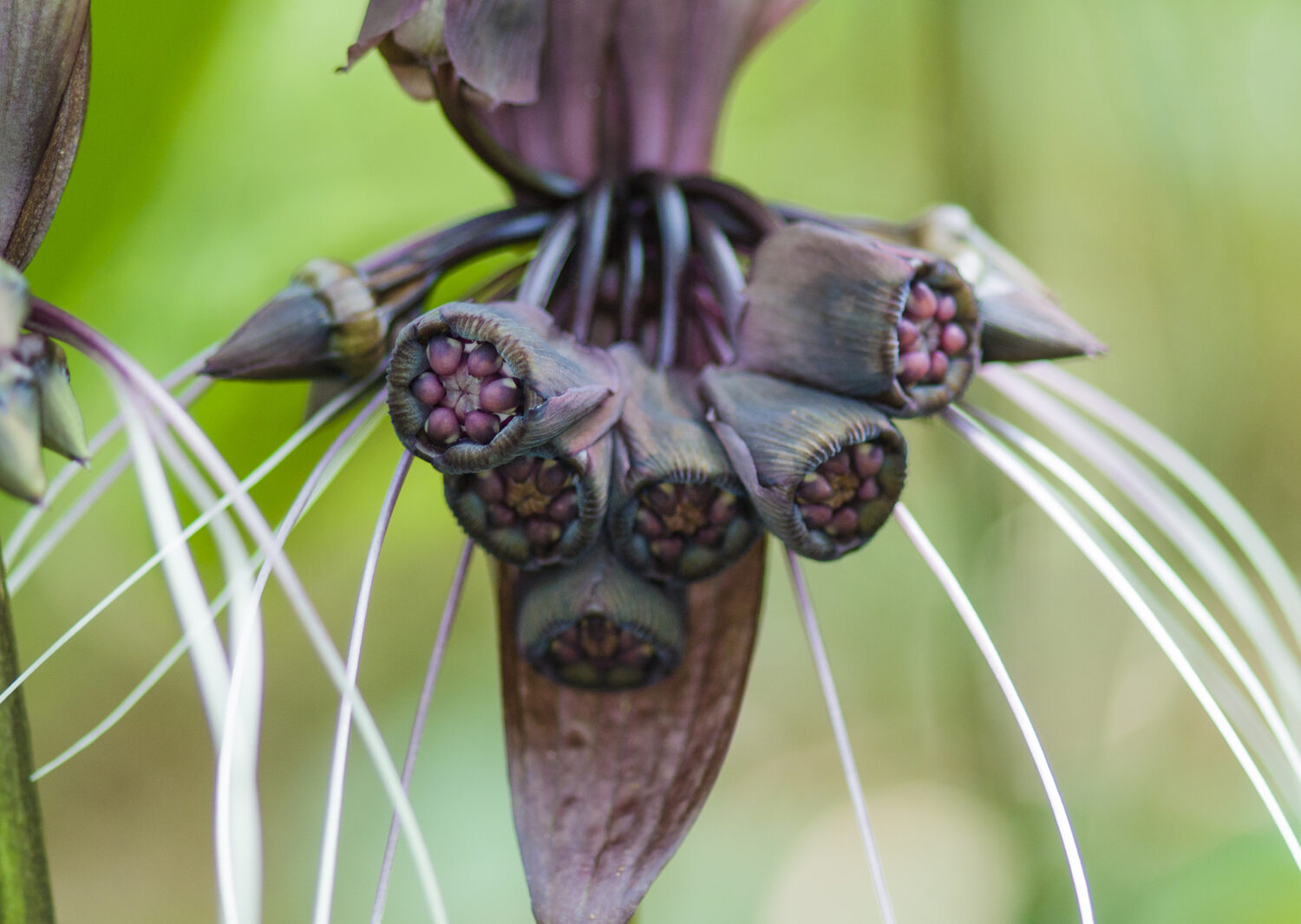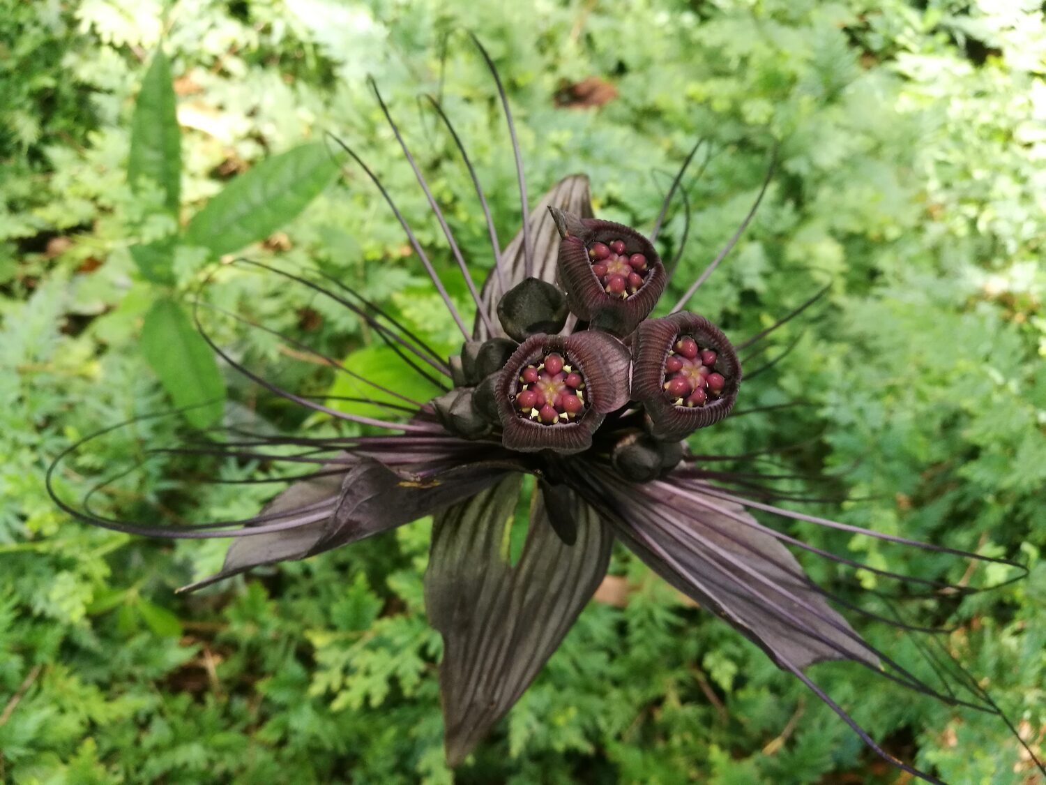 Tacca chantrieri is a rare and exotic perennial herb native to the tropical forests of Southeast Asia. It is renowned for its striking black to dark purple flowers resembling a bat in flight, complete with long whisker-like bracts that can extend up to 30 centimeters. The plant grows 60 to 90 centimeters tall, forming lush clumps of large, glossy green leaves. It thrives in warm, humid, shaded environments with rich, well-drained soil. Ideal for tropical gardens or indoor cultivation, the Black Bat Flower adds a dramatic and mysterious touch to any plant collection.