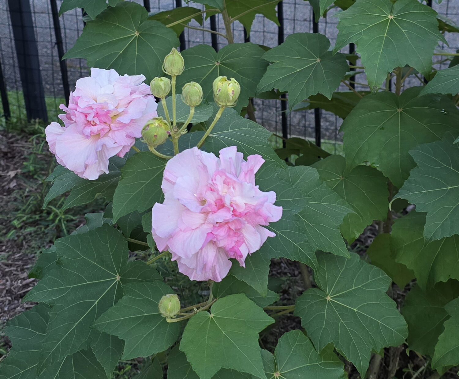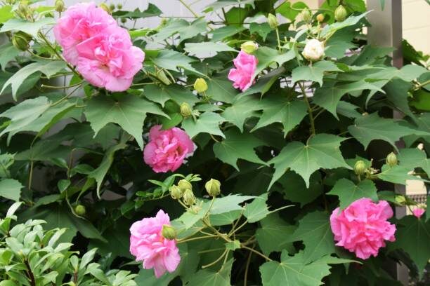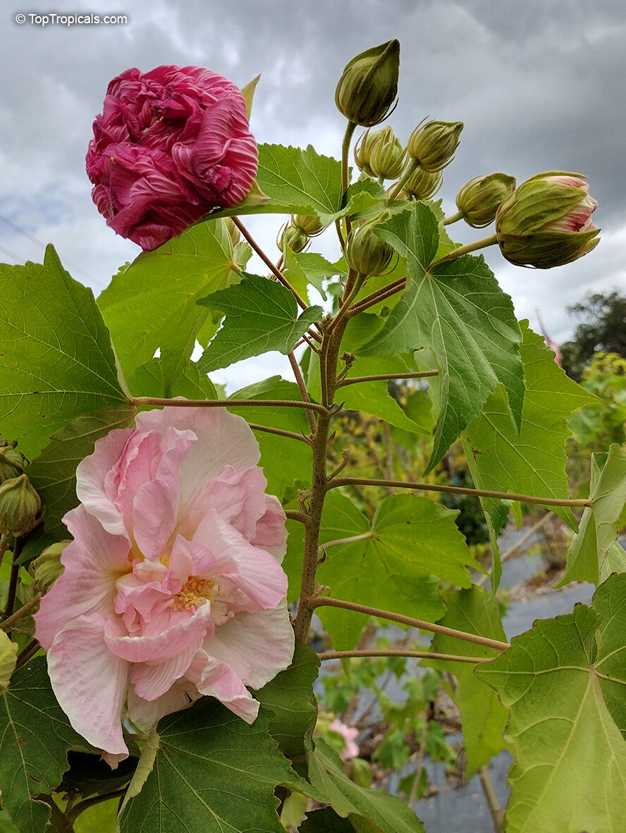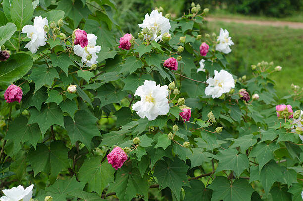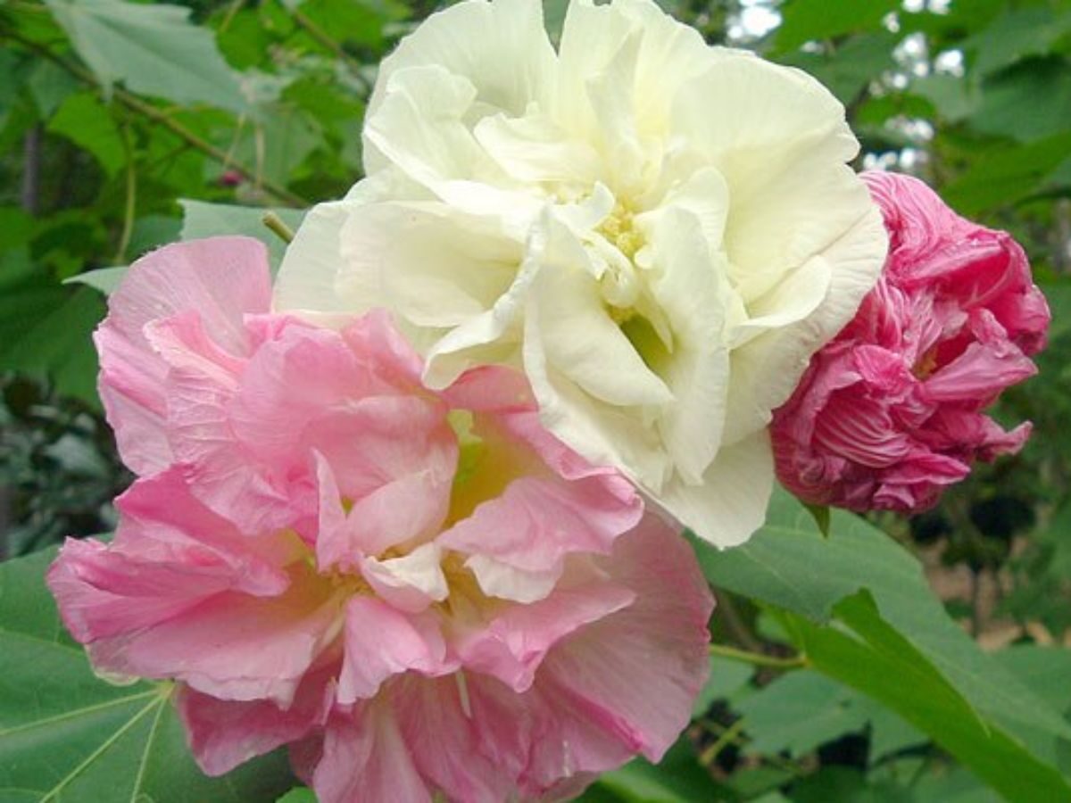 Hibiscus mutabilis, commonly known as Confederate rose or cotton rose, is a large, deciduous shrub or small tree in the mallow family (Malvaceae). Native to China and widely cultivated in warm climates, it can grow 2 to 5 meters tall and is admired for its spectacular flowers that change color over the course of a day, from white in the morning to pink and then deep rose by evening.