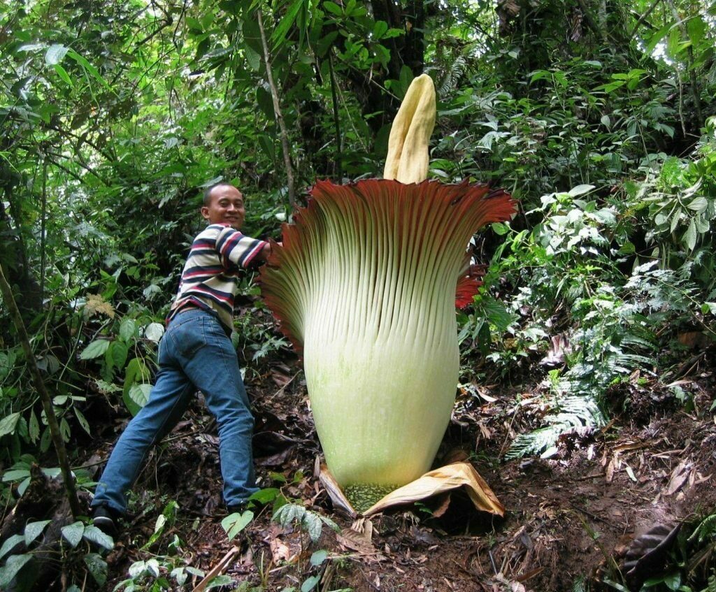 A giant aroid that grows an enormous, single pinnate leaf on a thick, fleshy stalk from a huge, bowl-shaped tuber, about 30 cm (1 ft.) in diameter. When the leaf wilts in Winter or the dry season and the plant goes into dormancy, the tuber can be dug up and stored dry. Before a new leaf is produced, mature plants can sprout a giant, maroon inflorescence that is truly a spectacular sight, but emits a rather unpleasant smell. This giant aroid has been cultivated for centuries in the Indopacific region for the edible tuber and its native origins are obscured today.