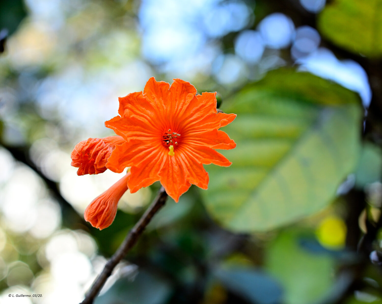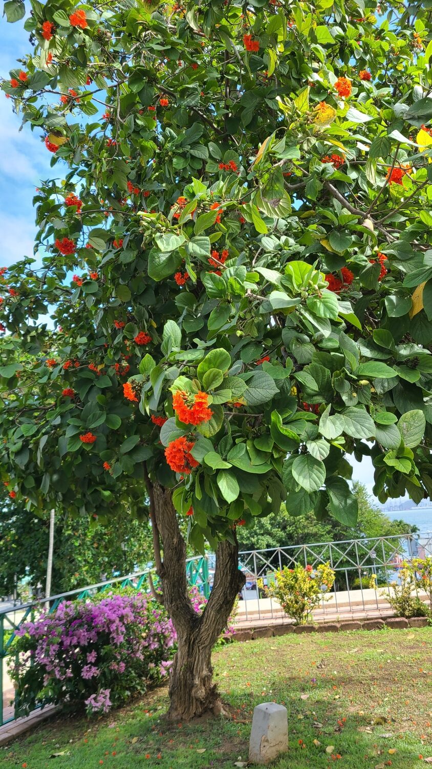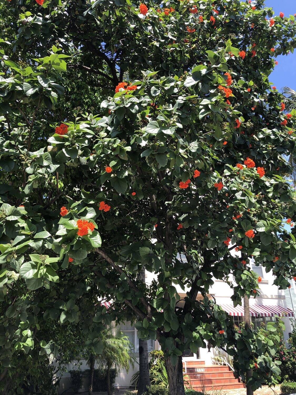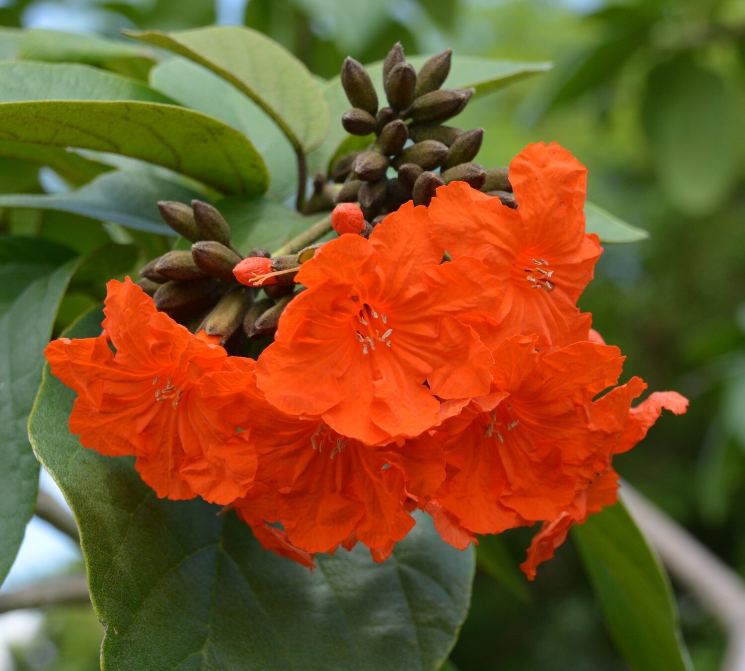The tree is best known for its brilliant clusters of bright orange-red, funnel-shaped flowers that bloom throughout the year in warm climates, attracting hummingbirds and butterflies. Its small, white fruits are oval and slightly sticky when ripe.