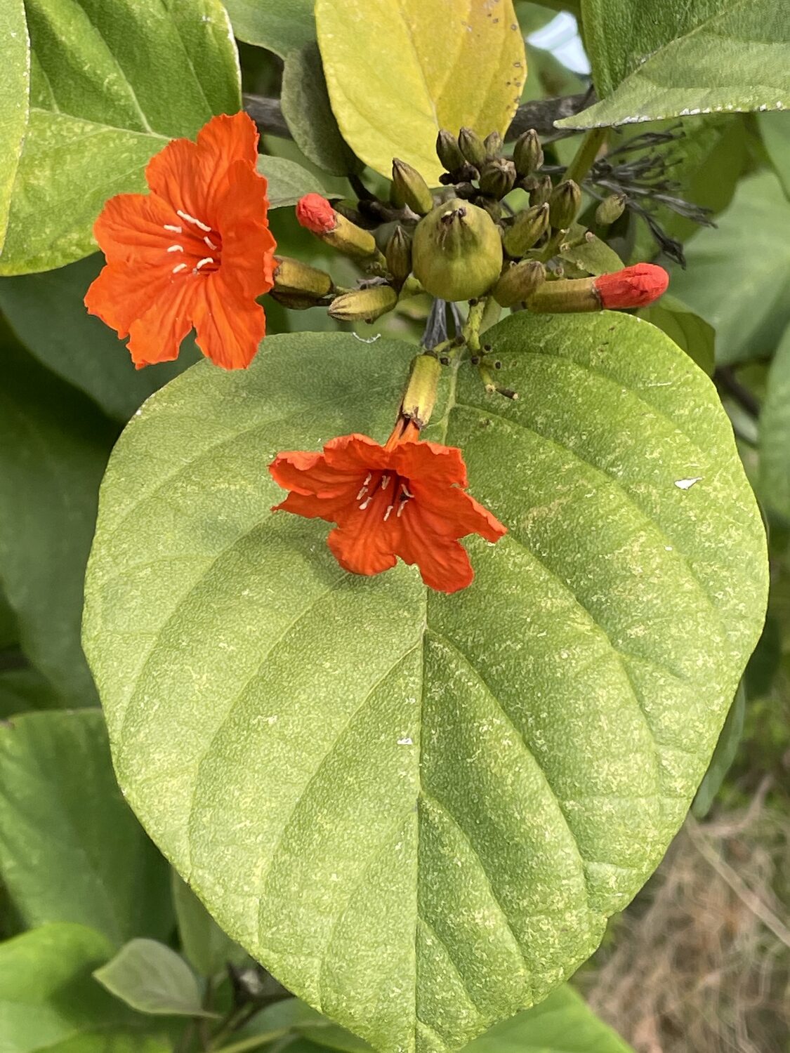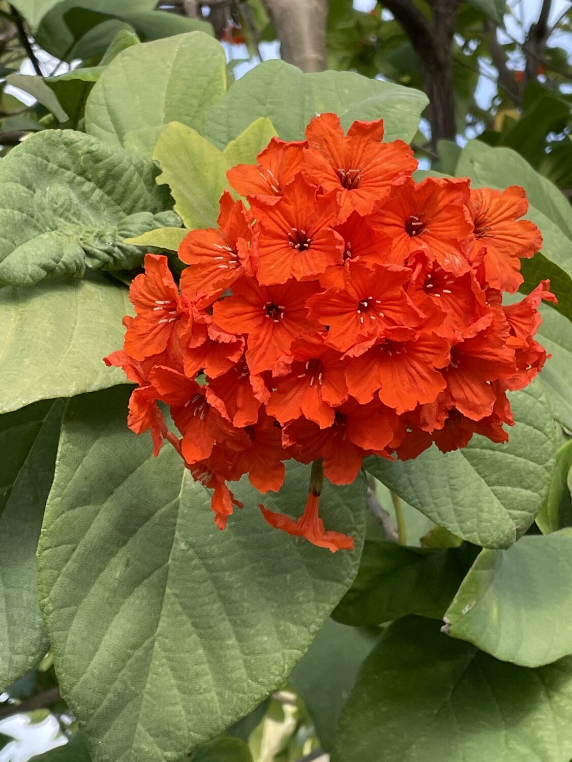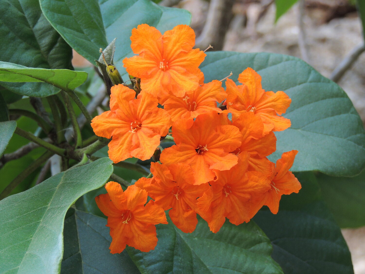 Cordia sebestena is a small, evergreen tree or large shrub native to the Caribbean and tropical Americas. It typically grows 3 to 8 meters tall, with a rounded crown and dense, rough-textured foliage. The leaves are large, dark green, and slightly coarse to the touch.