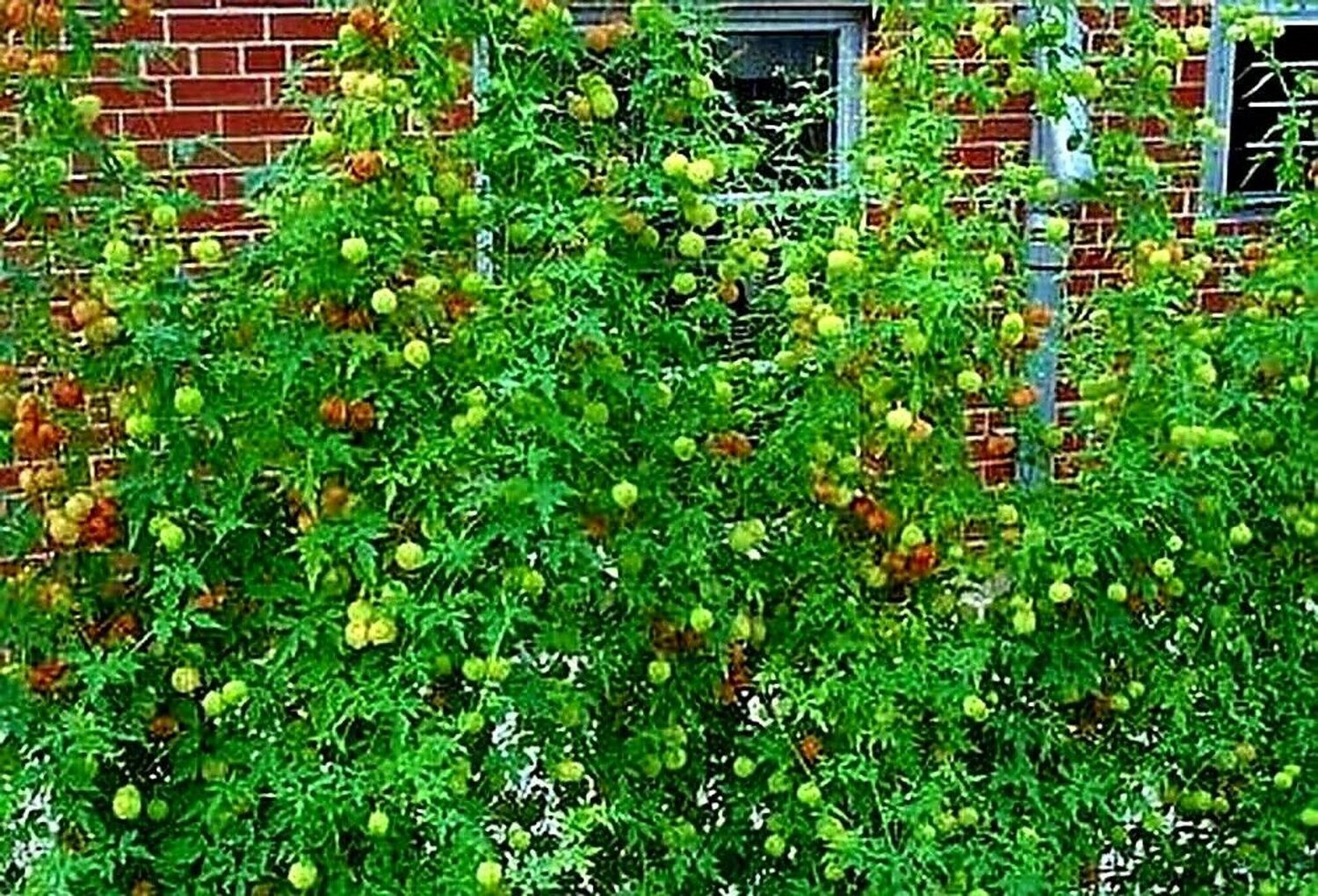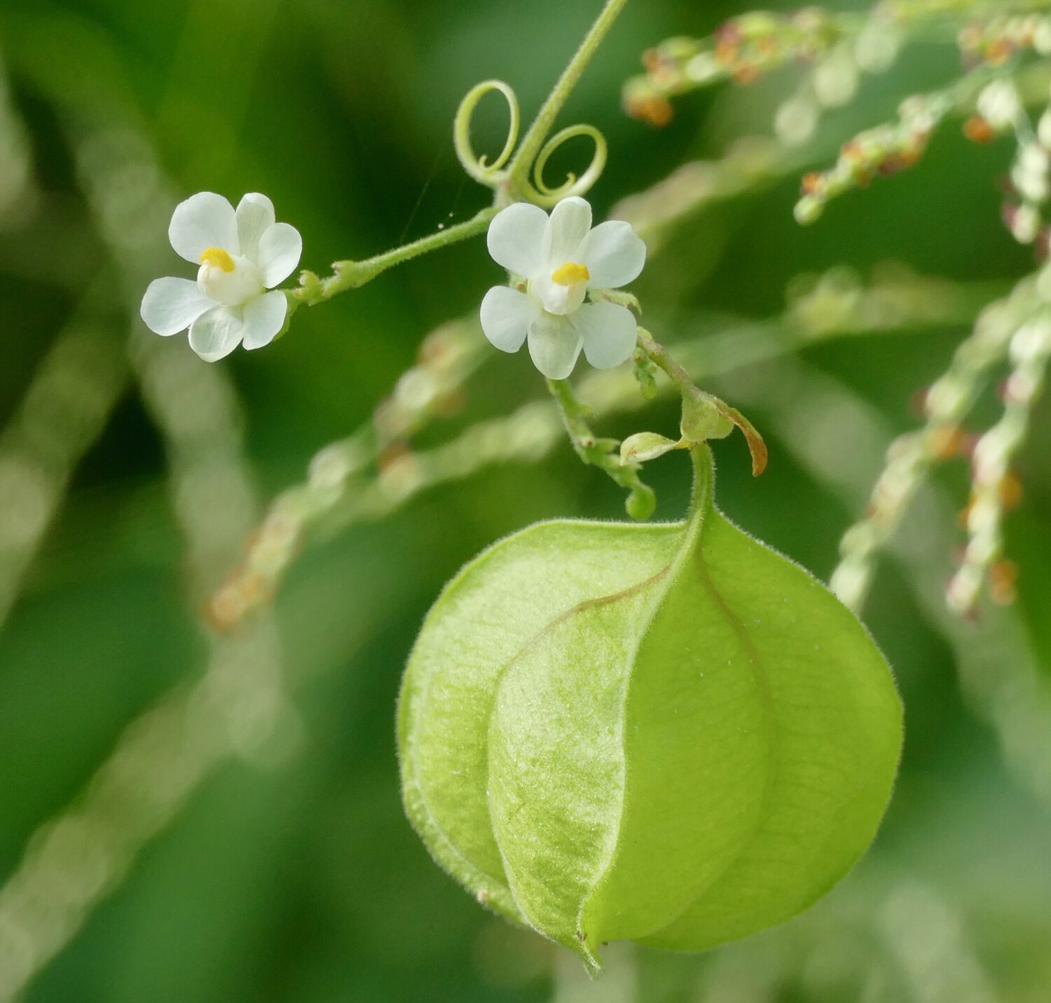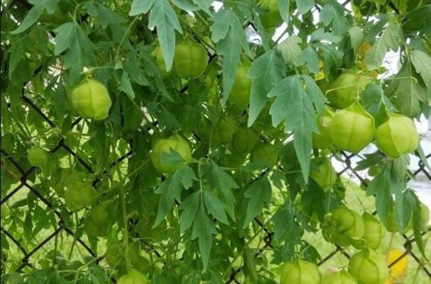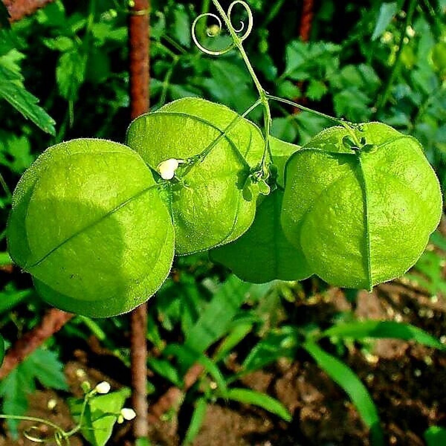 A small, short-lived vine with string-like stems, deeply lobed compound leaves and tiny white flowers followed by puffy seed pods that look like litte green lanterns. Cardiospermum means “heart-seed” and refers to the heart-shaped, pale hilum on the black seeds. It has a pan-tropical distribution. It makes an unusual ornamental that can be grown as an annual in temperate climates.