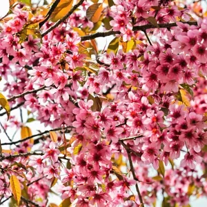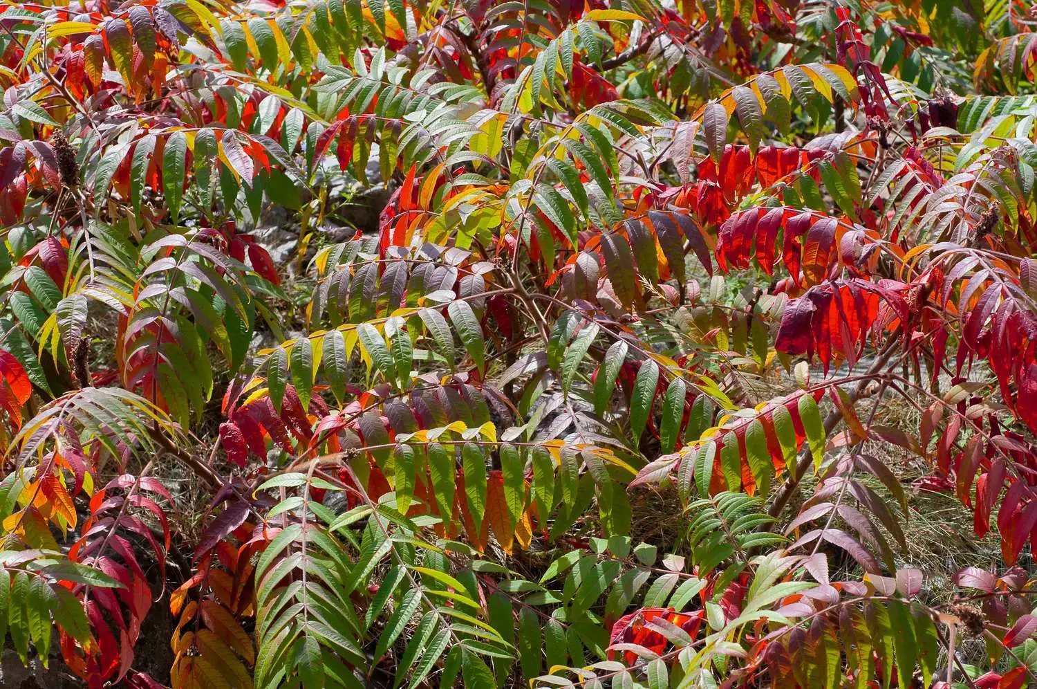 The tree is highly valued for its dramatic ornamental features. In the autumn, its large, compound leaves turn brilliant shades of red, orange, and scarlet. In summer, female plants produce striking, upright, cone-shaped clusters of fuzzy, crimson berries that can persist through the winter, providing a distinctive visual accent against the snow. Staghorn Sumac spreads vigorously by root suckers and is often grown for its ability to form dense colonies, making it useful for naturalized areas or for controlling erosion on slopes.