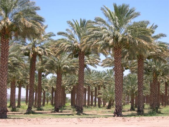The date palm (from the Arabic ?????, tamar) or date palm (Phoenix dactylifera) is a palm tree extensively cultivated for its edible fruits, the dates. Because it has been cultivated for millennia, its natural area of ??distribution is unknown, but it would originate from the oases in the desert zone of North Africa, although there are those who admit an origin in southwest Asia. It is a medium-sized palm tree, 15 to 25 meters tall, sometimes appearing in clumps, with several spikes (palm tree stem) sharing the same root system, but generally growing isolated. The leaves are pinnate fronds, up to three meters long, with a spiny petiole and around 150 leaflets. Each leaflet is about 30 cm long and 2 cm wide.