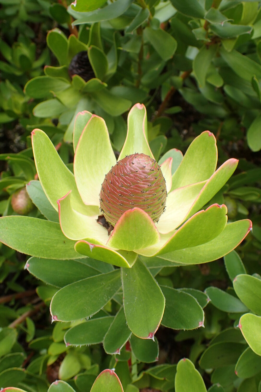 Leucadendron strobilinum is an attractive evergreen shrub native to the Cape fynbos of South Africa. It grows up to 2 meters tall and is admired for its narrow silvery-green leaves and showy yellow flower bracts that appear in spring, adding brightness to the landscape. Like other members of the Proteaceae family, it is well adapted to dry, sandy, and acidic soils, thriving in full sun with good drainage. Its seed cones and bracts are also prized for use in cut flower arrangements. This hardy, low-maintenance shrub is ideal for waterwise gardens, coastal areas, and habitat restoration projects.