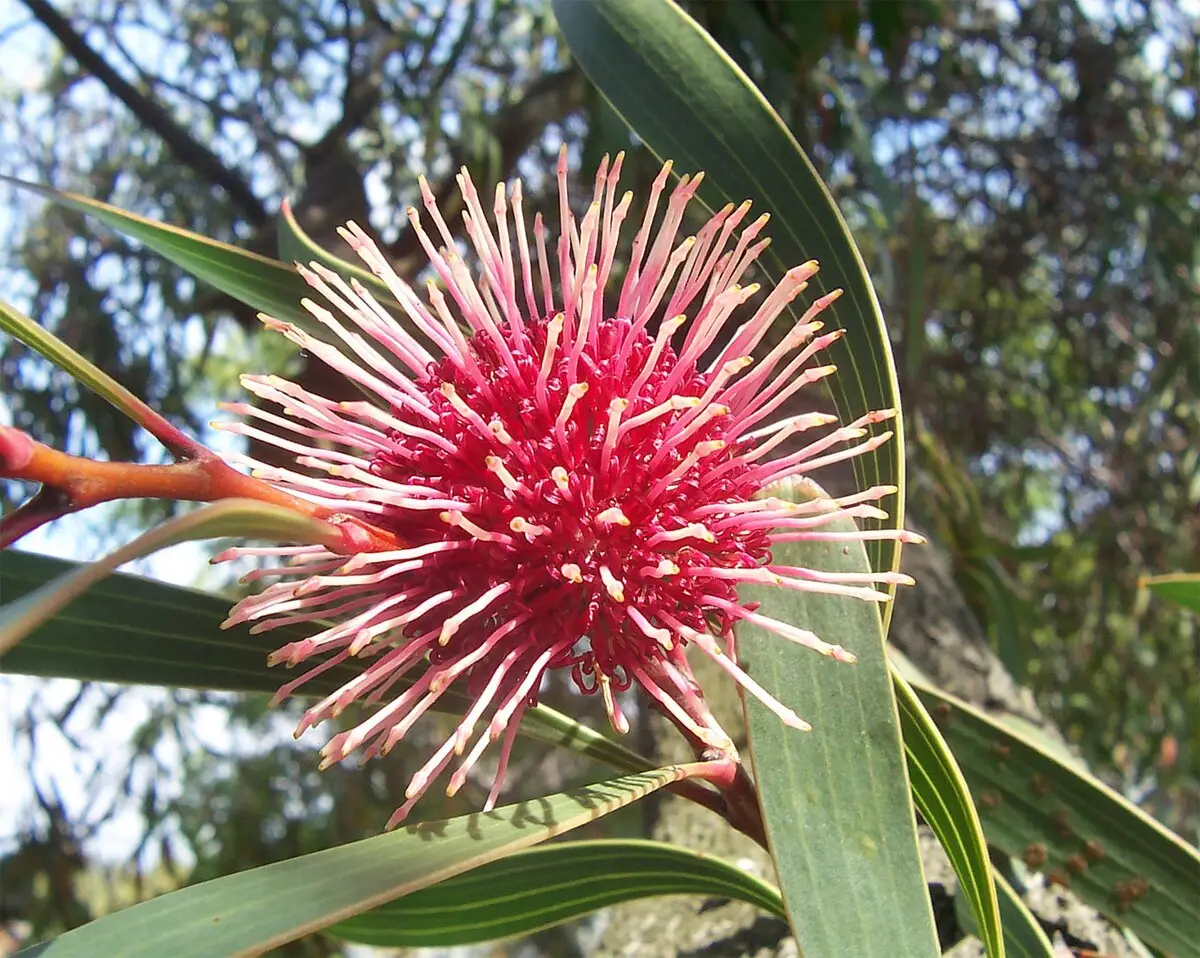 Hakea laurina, commonly known as the pincushion hakea, is a small to medium-sized evergreen tree or shrub native to southwestern Australia. It is highly valued for its striking and unusual flowers that appear from autumn to winter. These flowers are globular, with a deep red “cushion” from which many long, white to cream-colored styles protrude, giving them a distinct pincushion appearance. The plant has dense, bluish-green, lance-shaped leaves.