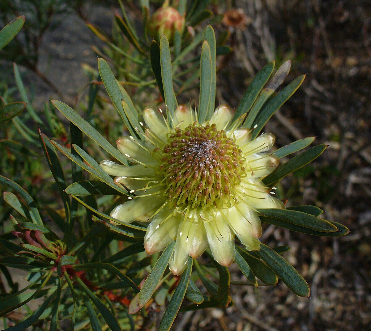 Common name: Thistle Sugarbush, Thistle Protea, Small Green Protea, Scoly, Kleingroenroos