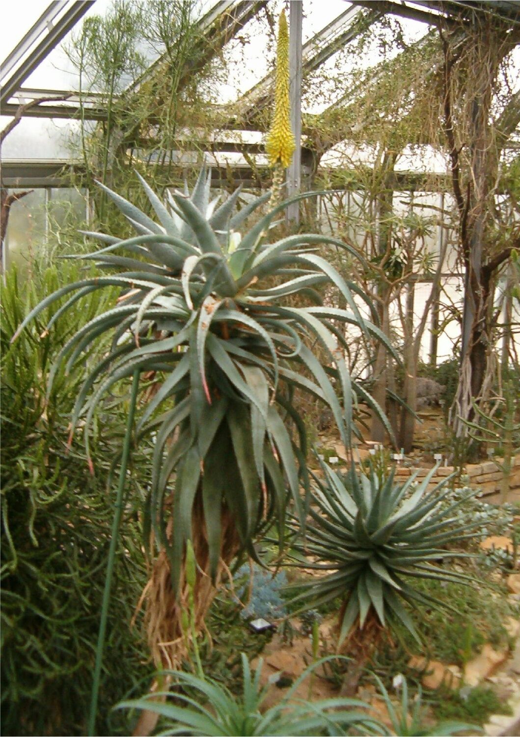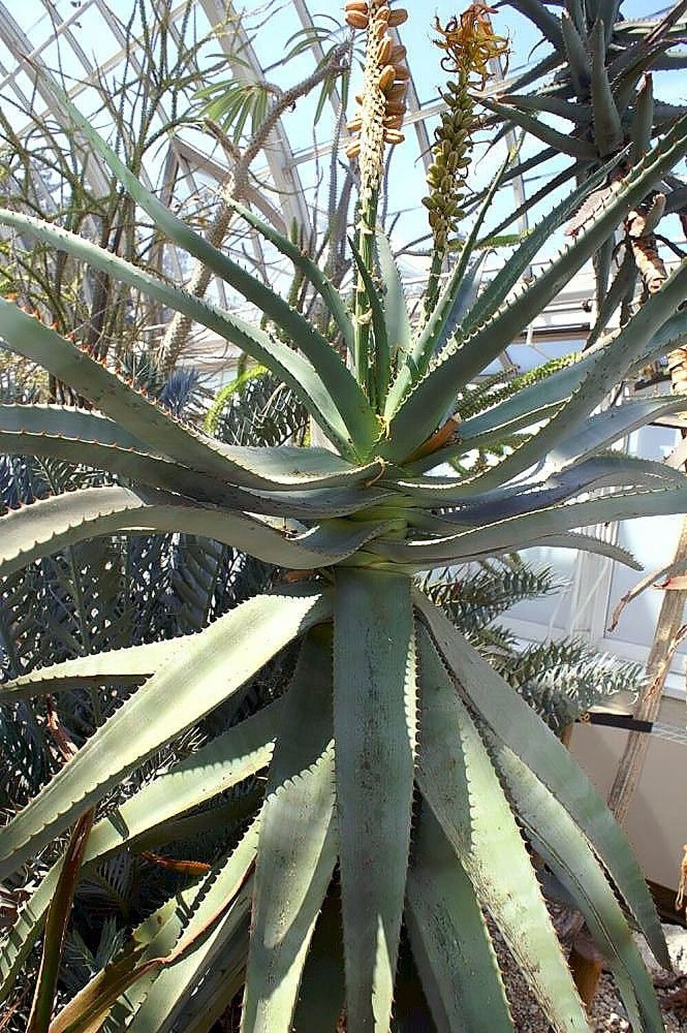A large Aloe native to low, dry scrubland in South Africa’s Cape Province that can form stems to 4 m tall covered in persistent dead leaves. The broad, deeply keeled leaves are dull green to bluish, the large inflorescence is branched only in a few long, densely flowered spikes. As easy to grow as most other large Aloe, it makes a stunning plant for cultivation in warm temperate and some tropical climates in USDA Zones 9 and above.