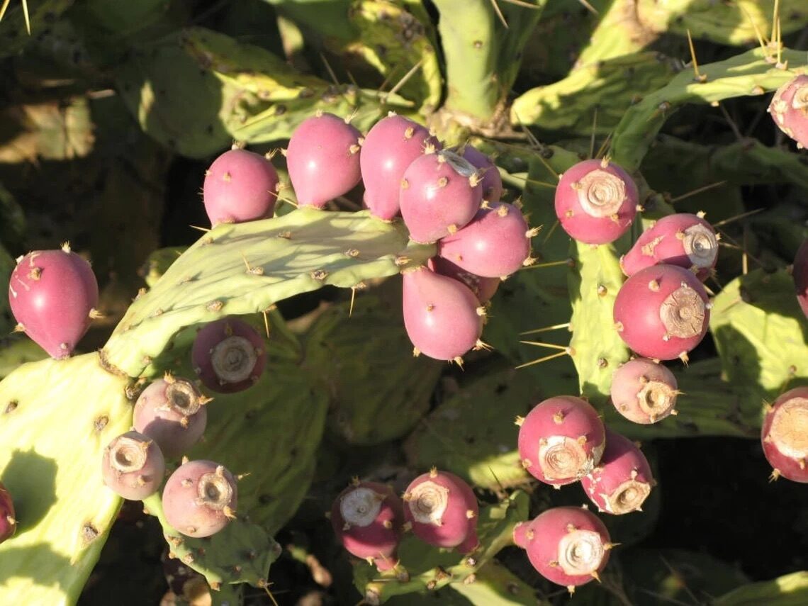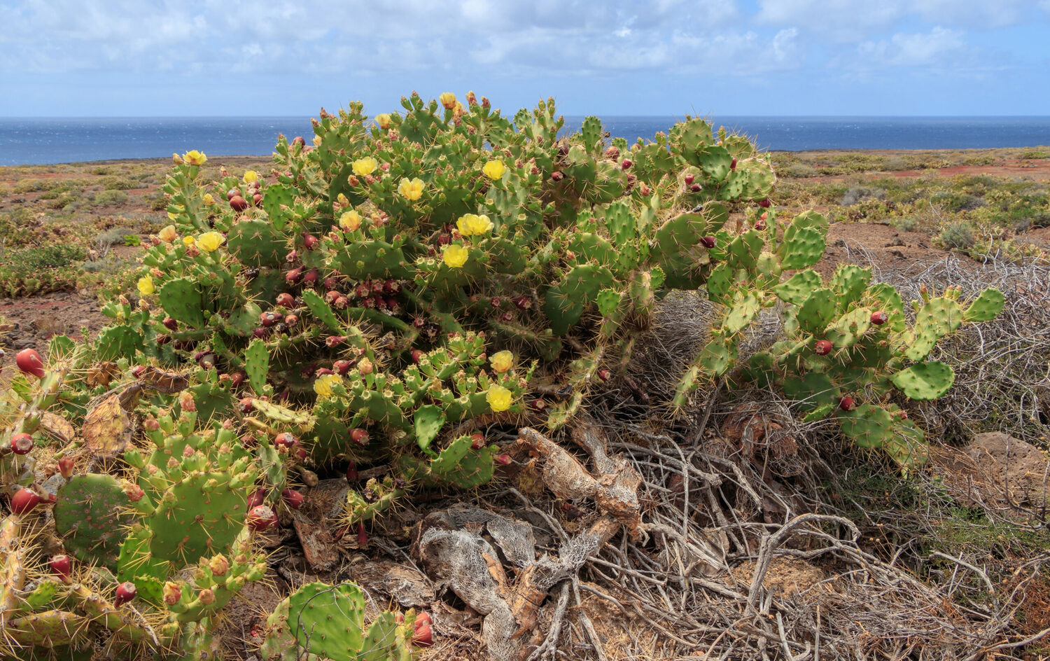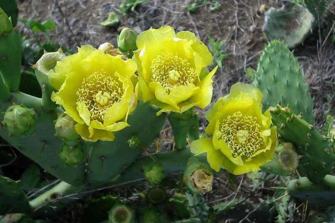 This cactus forms a spreading shrub to about 3 m tall with flat, spiny, blue green shoots to 40 cm long and red, edible fruits. Opuntia dillenii is widely distributed from the southeastern US to Mexico, the Caribbean and northern South America. Like other Opuntia it is easily grown and hardy to some drought and moderate freezes.