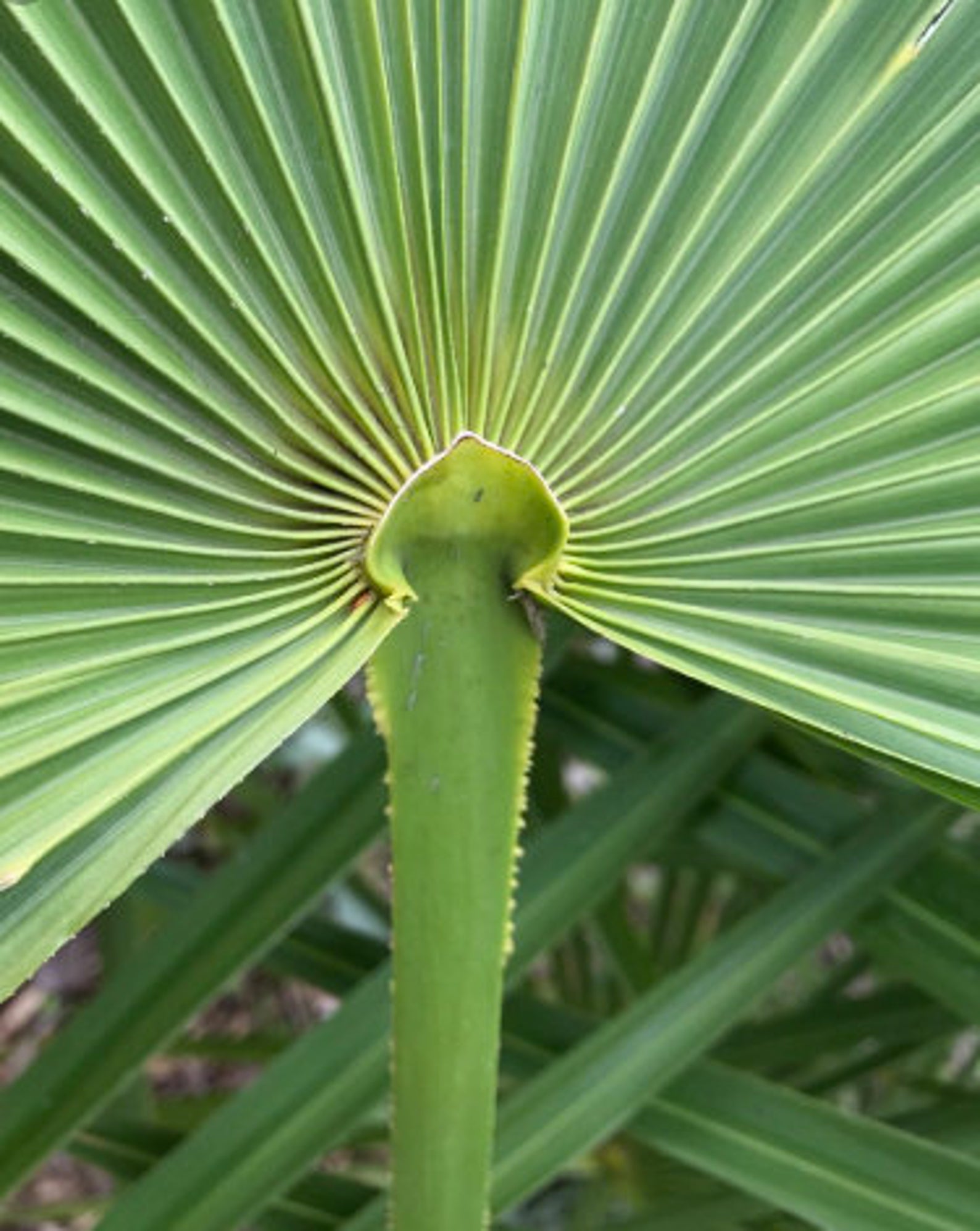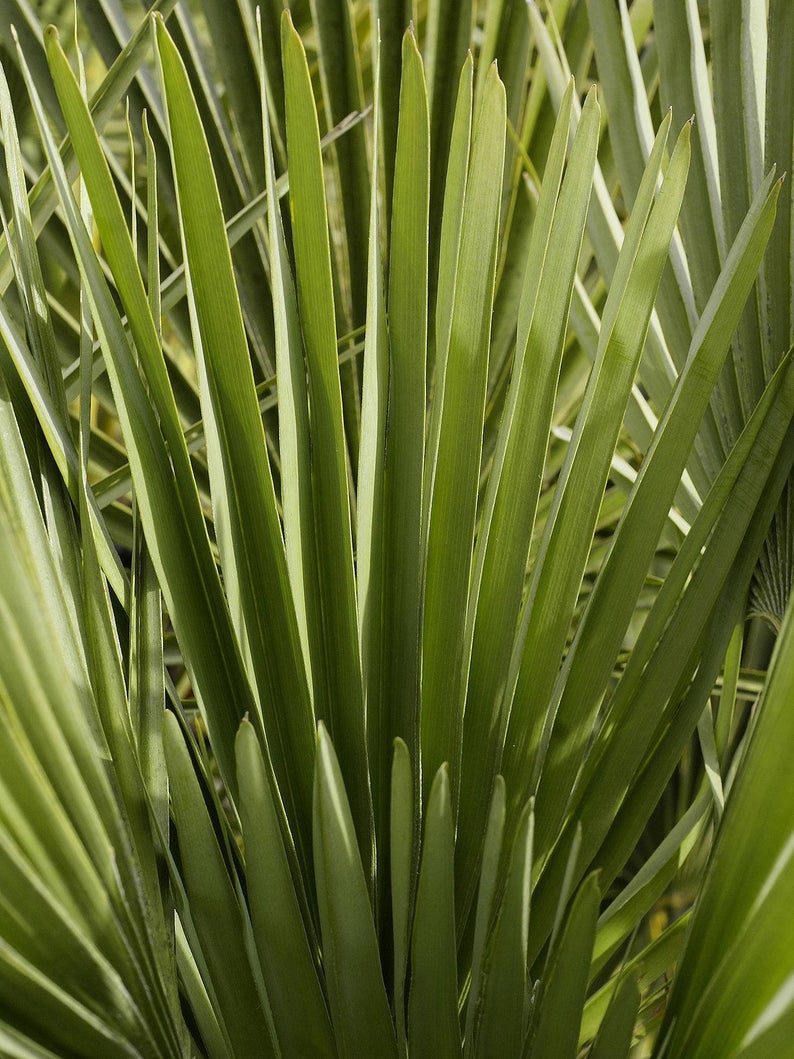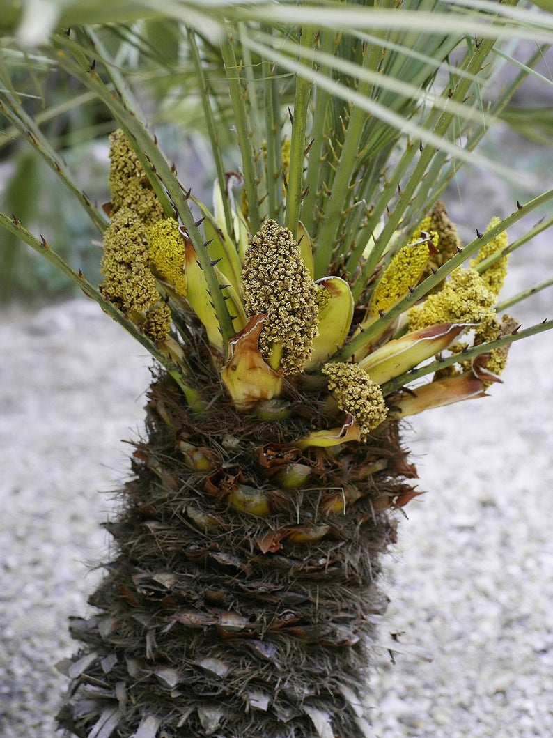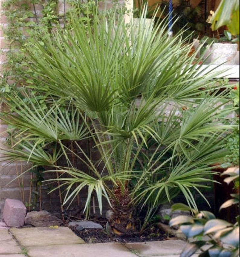 The Blue Mediterranean Fan Palm, which grows in the Atlas Mountains in Morocco up to 1700 m (5600 ft.), offers all the virtues a palm enthusiast from outside the tropics could wish for. It is as robust and adaptable as its regular green relative and happy in a wide range of conditions, tolerating extremes of cold and damp, heat and drought, and full sun and shade. However, its main attraction is the color of its leaves: the upper and lower surfaces of the leaf blade are an intense powdery blue silver (and here we don’t mean the comparatively faint silvery color as seen on the undersides of the leaves of many Chamaerops). It is easily as silvery blue as the best Brahea armata or Bismarckia. Under the laws of botanical nomenclature this palm would actually correctly be called Chamaerops humilis var. argentea, with Chamaerops humilis var. cerifera as a synonym. We have decided to list it as Chamaerops humilis var. cerifera for the time being however, a) because it is by now a well known name in the trade and b) because the name Chamaerops humilis var. argentea has frequently but erroneously been applied to Chamaerops with silvery leaf undersides, not at all connected or comparable to the plant discussed here. We were the first to market and popularize the Blue Mediterranean Fan Palm in the early 1990’s with the help of legendary Morocco nurseryman Sadek Tazi, and our seeds are still collected in the High Atlas Mountains and provide a welcome supplemental income for local folks.