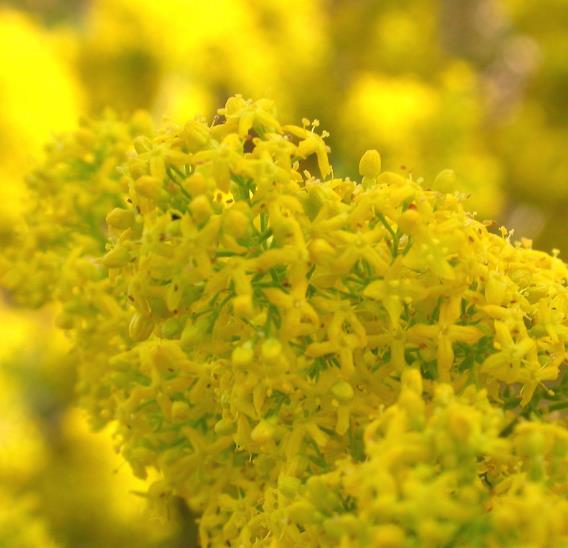 The yellow flowers are produced in dense clusters and exude an intense fragrance of honey and vanilla.