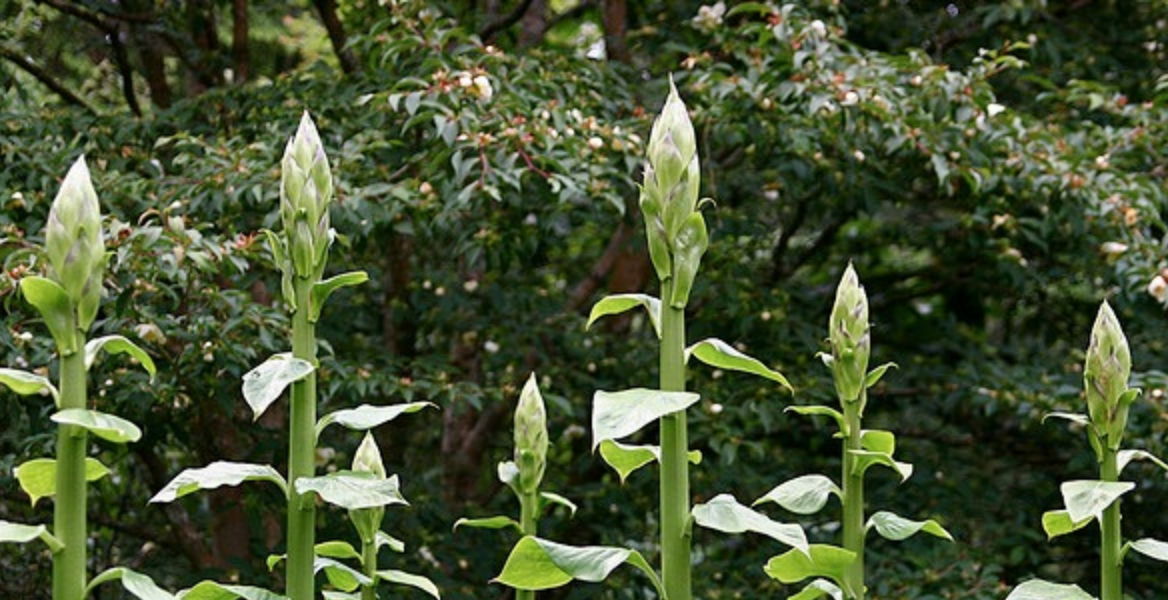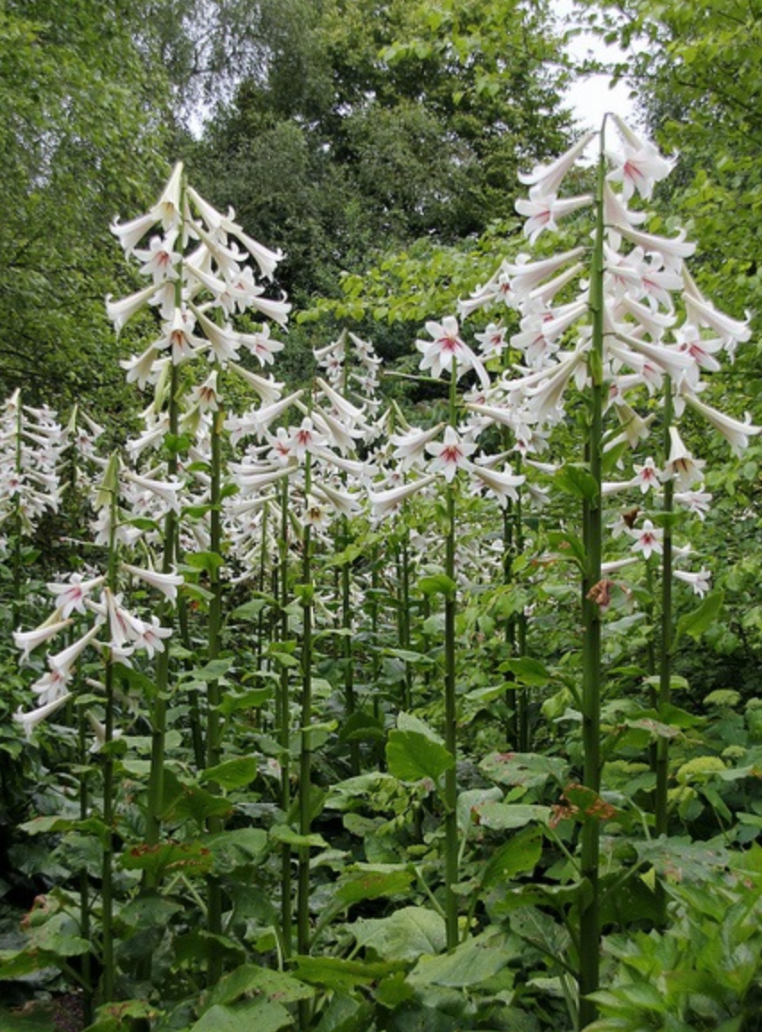 A giant lily native from the Himalayas to northern Myanmar and China that produces a stalk every spring to eventually more than 3 m (10 ft.) tall from an underground bulb. The leaves are large and heart-shaped or oval. After 6 or more years from seed, huge, most magnificently scented white flowers appear in a terminal inflorescence. After flowering, the main bulb dies but produces several offshoots that will flower after 3 to 4 years. It will grow without much protection in USDA Zones 8 to 9 but can also be grown in colder climates with heavy mulching to keep the ground frost free.