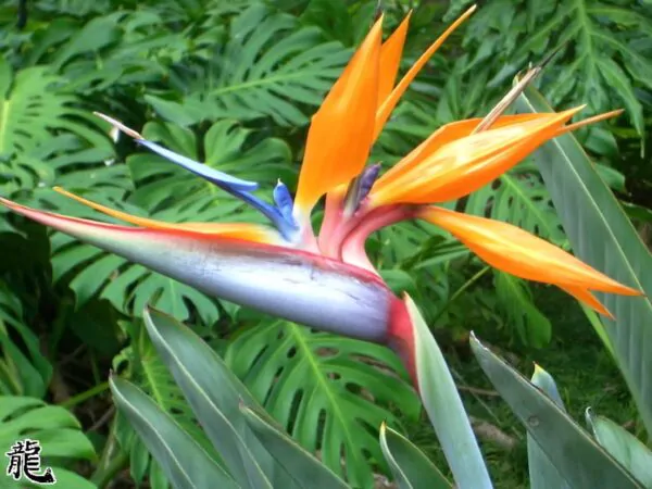 The plant grows to 2 m (6.6 ft) tall, with large, strong leaves 25–70 cm (9.8–27.6 in) long and 10–30 cm (3.9–11.8 in) broad, produced on petioles up to 1 m (39 in) long. The leaves are evergreen and arranged in two ranks, making a fan-shaped crown. The flowers stand above the foliage at the tips of long stalks. The hard, beak-like sheath from which the flower emerges is termed the spathe. This is placed perpendicular to the stem, which gives it the appearance of a bird’s head and beak; it makes a durable perch for holding the sunbirds which pollinate the flowers. The flowers, which emerge one at a time from the spathe, consist of three brilliant orange sepals and three purplish-blue or white petals. Two of the petals are joined together to form an arrow-like nectary. When the sunbirds sit to drink the nectar, the third petal opens to release the anther and cover their feet in pollen.