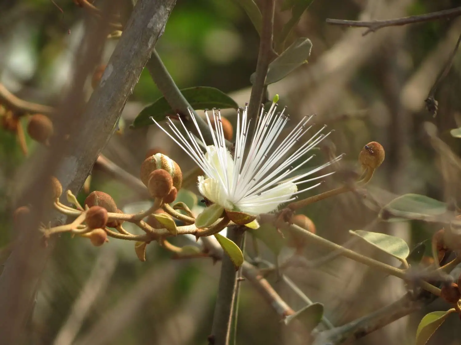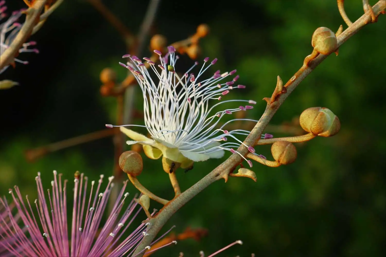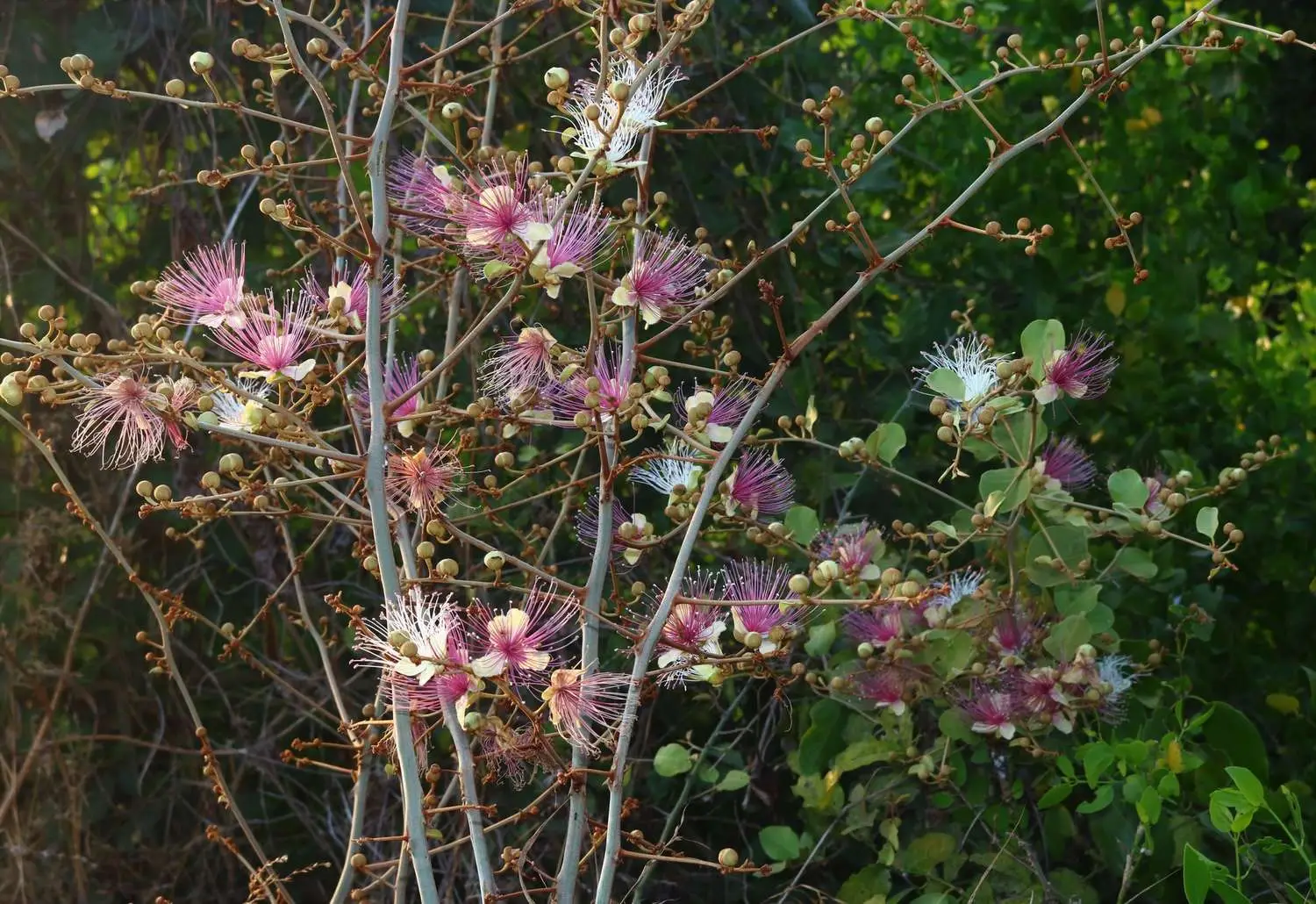 Ceylon caper is a large shrub, usually seen 2-5 m high. Thick stems have many climbing and drooping branches. Alternately arranged elliptic leaves are 3-6 cm long, with rounded base and short stalk. Beautiful flowers, which are essentially a spreading spray of pink-white stamens, are 4-5 sm across, and appear solitary in leaf axils. The flowers turn dark pink while fading.