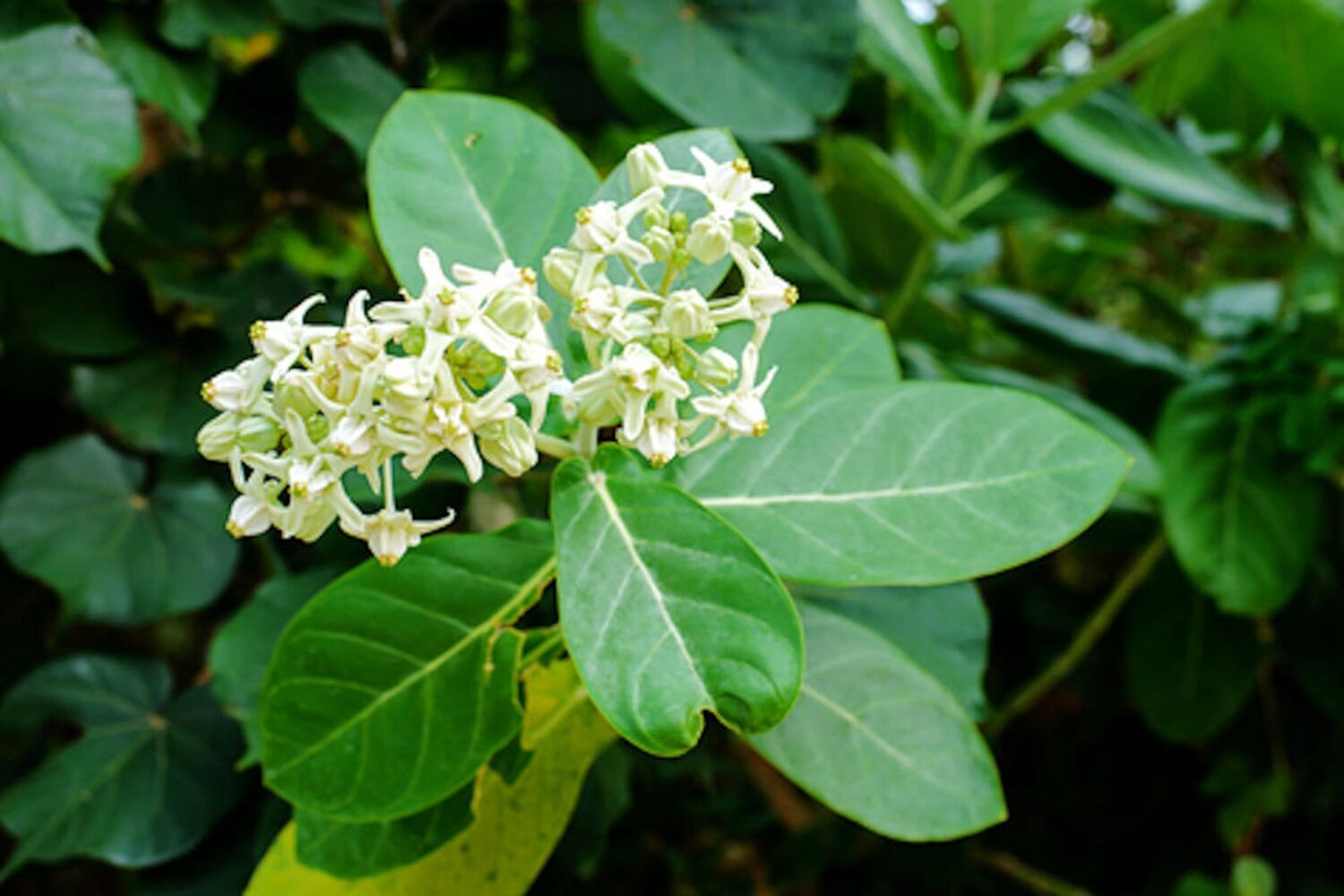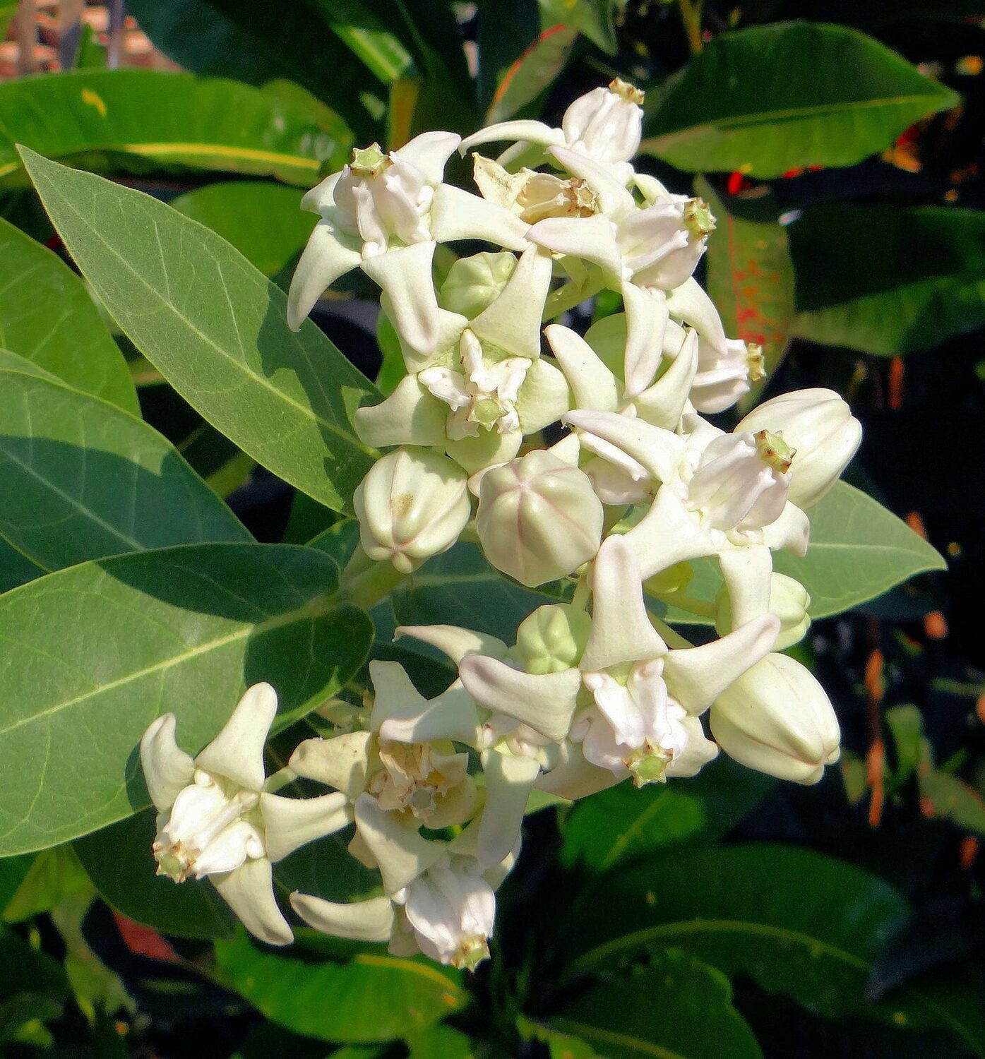 It is a large shrub growing to 4 m tall. It has clusters of waxy flowers that are either white or lavender in colour. Each flower consists of five pointed petals and a small “crown” rising from the center which holds the stamens. The aestivation found in calotropis is valvate i.e. sepals or petals in a whorl just touch one another at the margin, without overlapping. The plant has oval, light green leaves and milky stem. The latex of Calotropis gigantea contains cardiac glycosides, fatty acids, and calcium oxalate. The roots also contain Calotropone.