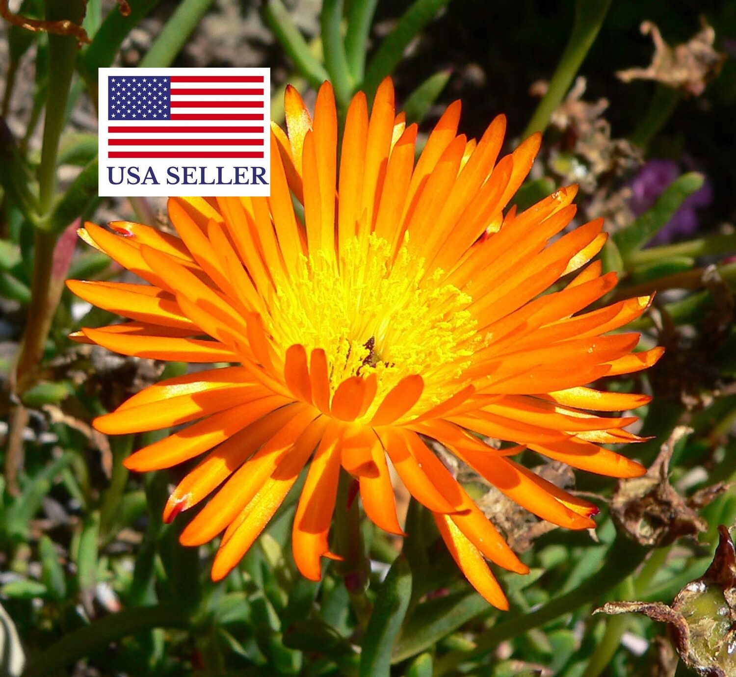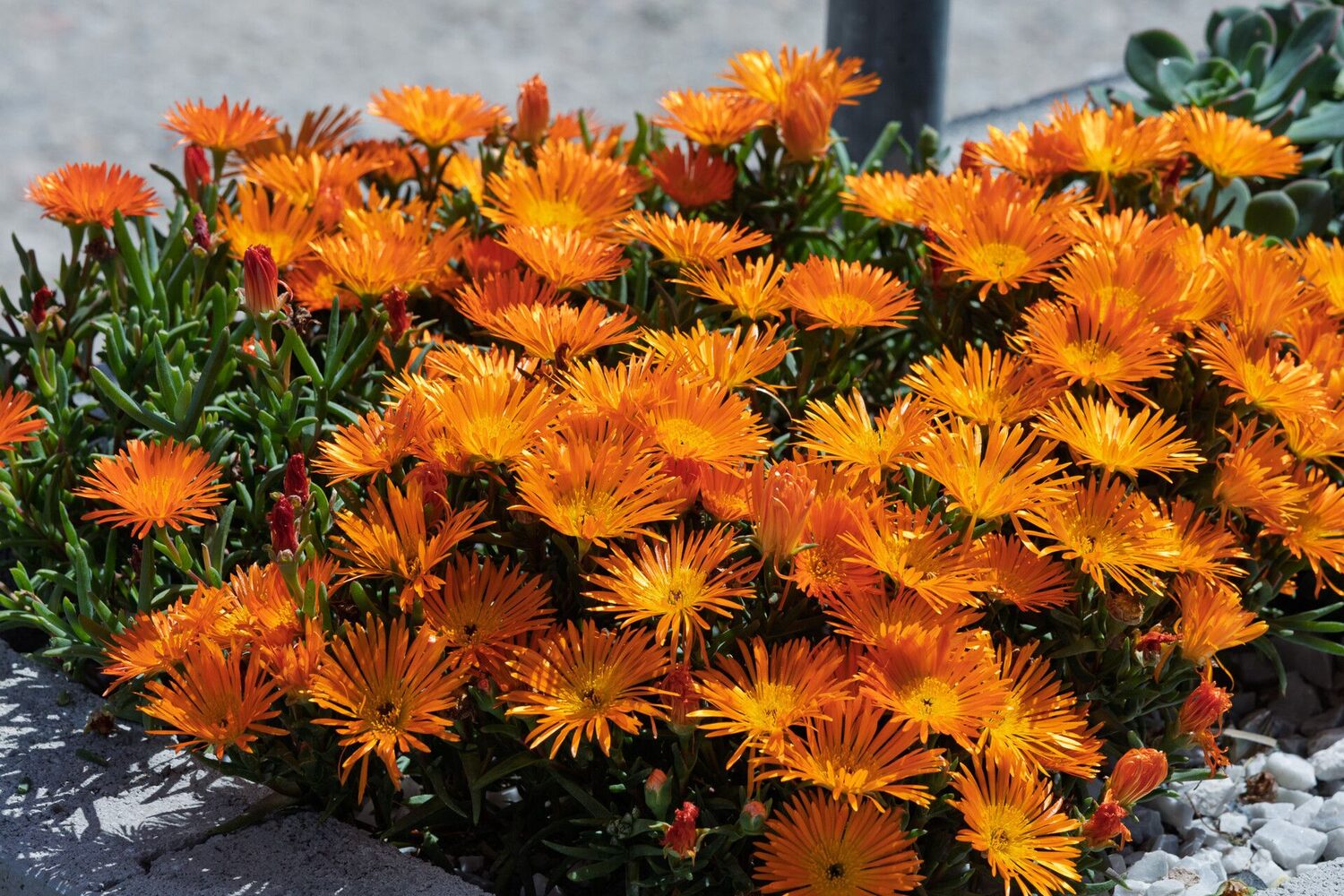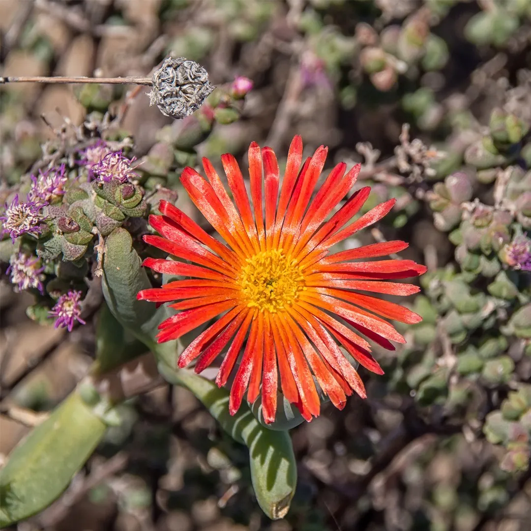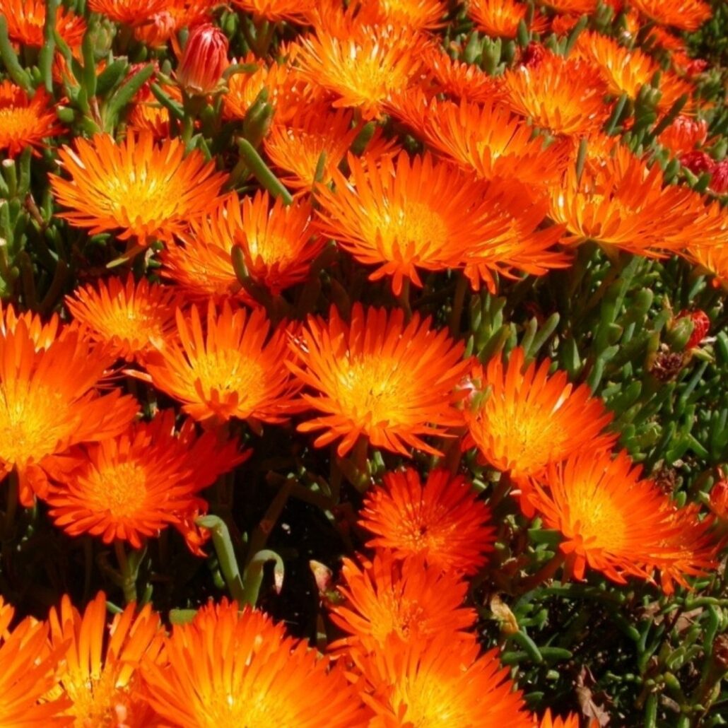 A neat, small, succulent shrub with thick leaves and masses of bright orange flowers. Lampranthus aureus is native to South Africa. In cultivation it does best in a mediterranean climate.
